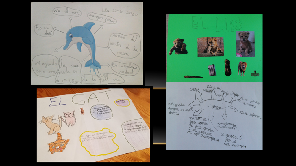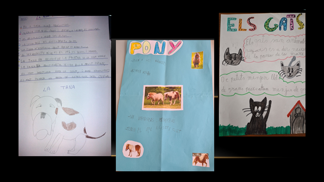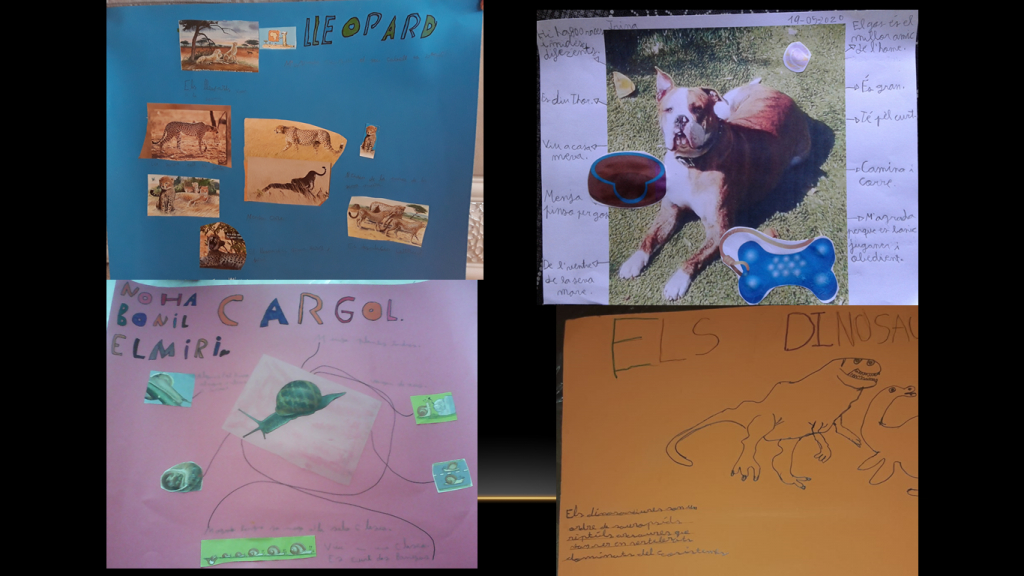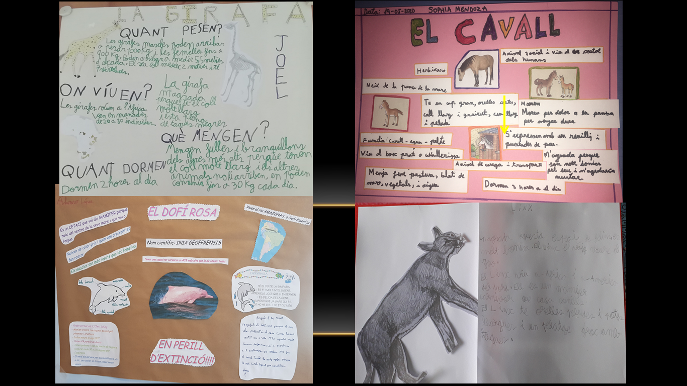 Per acabar el tema cada alumne ha escollit un animal i ha fet un treball d’investigació. A continuació us presentem una gran varietat d’animals: els dofins, els gats, els gossos, els elefants, el lloro, el poni, el pollet, el linx, el cavall, la girafa, l’àguila, el hàmster, la guineu, el lleó, el lleopard, el conill, el cargol, el dinosaure i la zebra.