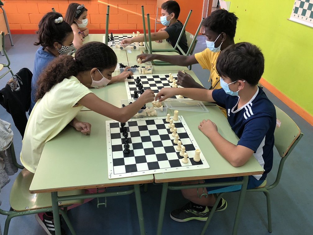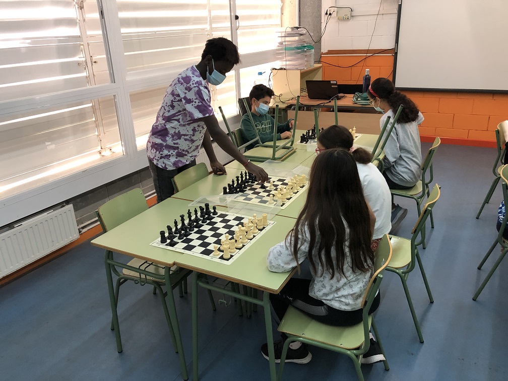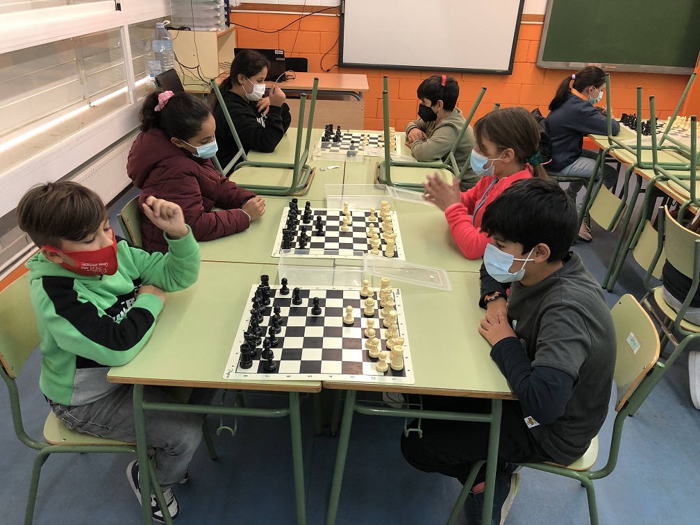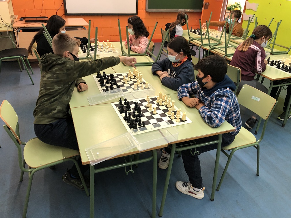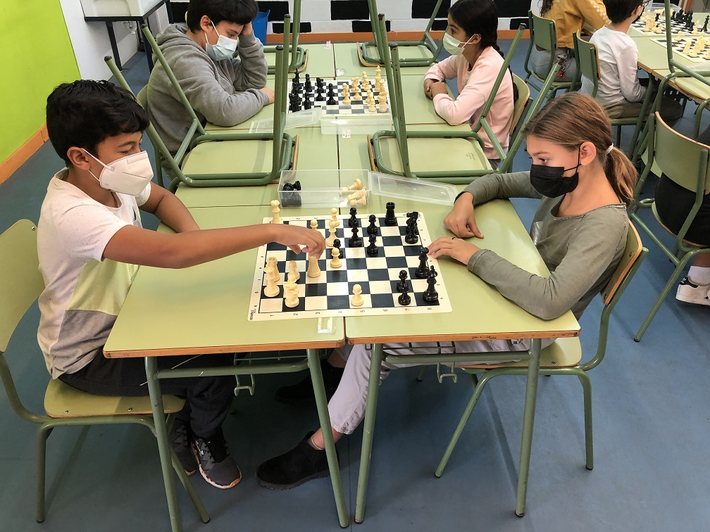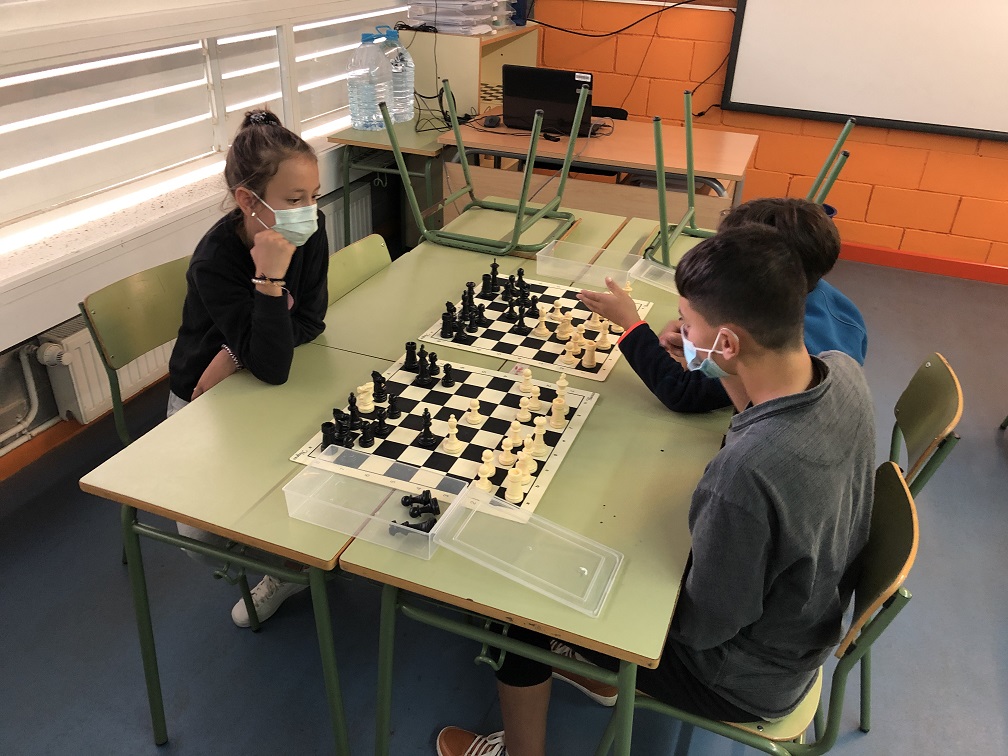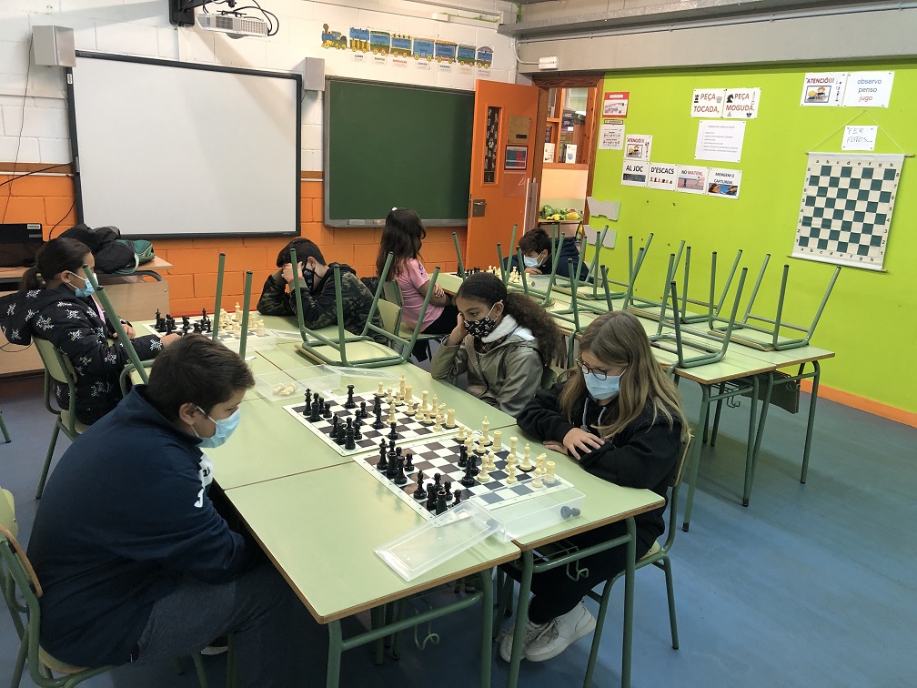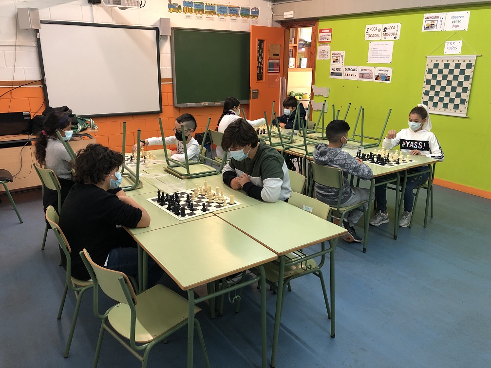 Durant aquest 1r trimestre, amb l’alumnat de 5è i 6è destaquen el treball de l’obertura amb l’enroc curt, les fases d’una partida (inici, desenvolupament i final) i la coronació, entre d’altres.