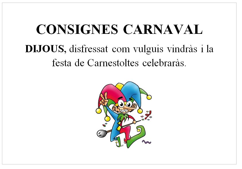 CONSIGNES CARNAVAL Feu un comentari / Per admin / 19 de febrer de 2020 / 1r 2n 3r 4t 5è 6è General I3 I4 I5 Infantil Portada Primària Papes i mames!!!! Aquí us deixem un recull de les fotos d’avui: I… només ens queda la consigna per demà. Preparats???? Aquí la teniu: