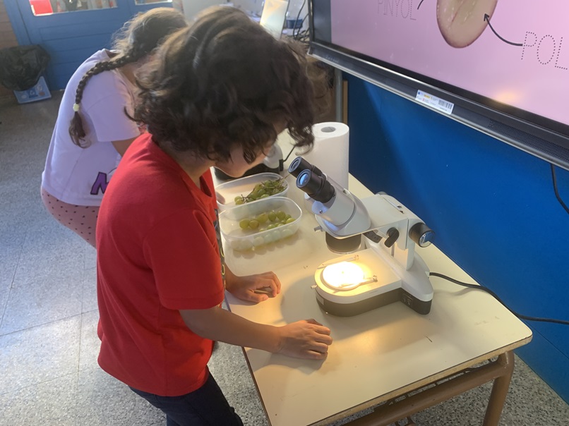 Un element essencial de la verema és el raïm així que tant a primer com a segon hem agafat les lupes i els microscopis per observar de ben a prop aquest fruit propi de la tardor. Ens hem embrutit, però hem descobert totes les seves parts. I clar, no ens podíem estar de tastar-lo, és deliciós!