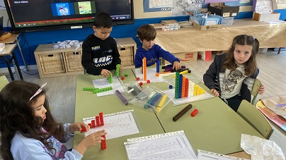 Per treballar les matemàtiques hem jugat amb les cartes dels números i els puntets, hem jugat a l’oca, hem descompost el número 10 amb cubets, hem observat quin és el número anterior i posterior d’un nombre, hem fet formes amb volum amb escuradents, hem jugat amb les tauletes i la pantalla digital a jocs matemàtics, hem fet simetries amb els miralls i hem copiat composicions geomètriques i hem començat a fer sumes.