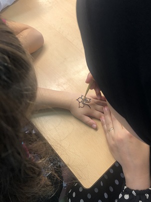 Per acabar, vam tenir la visita de la mare de l’Elias i la mare d’en Safwan. Ens van explicar moltes coses interessant de la cultura del seu país, el Marroc: com es vesteixen, què mengen i altres curiositats. També ens van ensenyar fotos dels seus pobles de naixement precioses. Tots i totes volem anar a visitar-los! Per acabar, ens van posar una cançó infantil dels sentits en àrab. Finalment, ens van fer un dibuix amb henna. Son unes artistes!!!