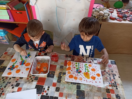- Flors: vam fer flors amb boletes de plastilina petites, vam dibuixar la tija amb retoladors verds, vam fer les fulles amb gomets verds i vam guarnir el quadre fent estampació amb taps de suro i puntillisme amb els bastonets de les orelles.
