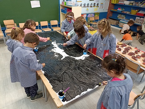 • Alguns cercles: amb pintura negra van fer el fons i van estampar cercles i rodones de diferents colors.