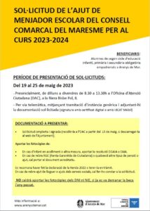 Beques Menjador 2023-2024Per admin / 8 de maig de 2023 / Beques i Ajuts General Portada Ajuts Menjador escolar del Consell Comarcal del Maresme per al Curs 2023-2024. Període de presentació del 19 al 25 de maig de 2023 .