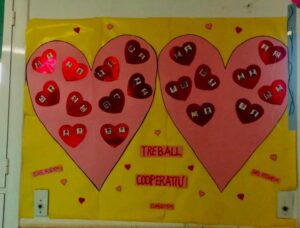 Dins el projecte d’escola “Treball Cooperatiu” els nens/es d’I3 ens hem iniciat en el treball per parelles: compartim la feina, ens ajudem, ens respectem i formem petits equips. Hem punxat un cor, dos companys/es junts, i després els hem penjat al passadís amb les nostres fotos. Ha quedat molt bonic!