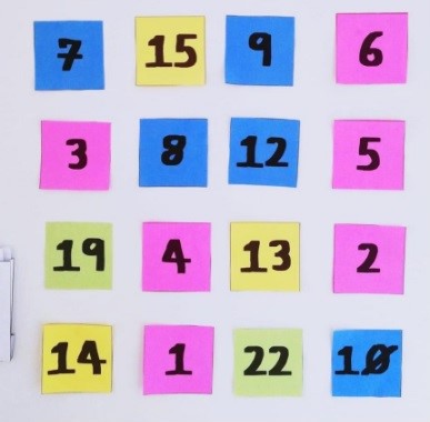 Preparació: has de fer unes targetes amb nombres de màxim dues xifres, però per jugar només en necessites 16! Com a la imatge següent. També pots fer els nombres utilitzant post-it.