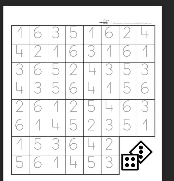 Numeració: Per perfeccionar el traç aquest joc de parelles, demaneu que jugui amb vosaltres un familiar. S’ha de tirar un dau i resseguir cada jugador un número amb un color diferent. Guanya qui completi el tauler.