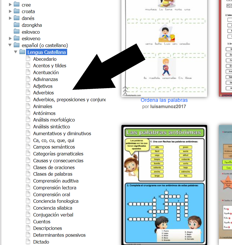 El enlace os llevará directamente a los ejercicios de lengua castellana, por lo tanto solo deberemos escoger los contenidos a trabajar, en la columna que muestra la flecha negra.