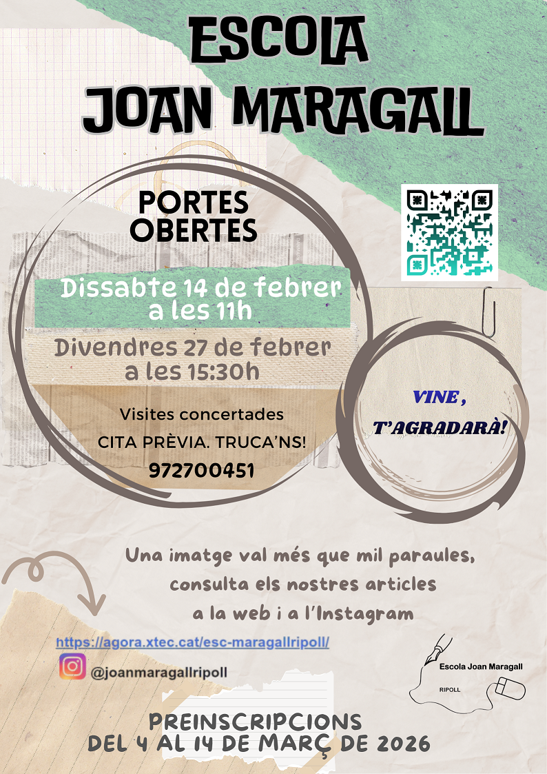 Vine a conèixer la nostra escola, t’agradarà! Ens podeu visitar el dissabte 14 de febrer a les 11h i el divendres 27 de febrer a les 15:30h. Si no podeu venir en aquestes dates, ens podeu trucar al 972700451 i concertar una cita personalitzada un altre dia i hora! Us esperem!