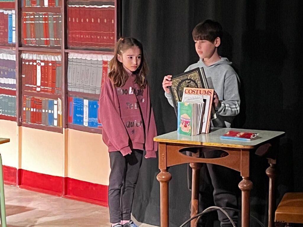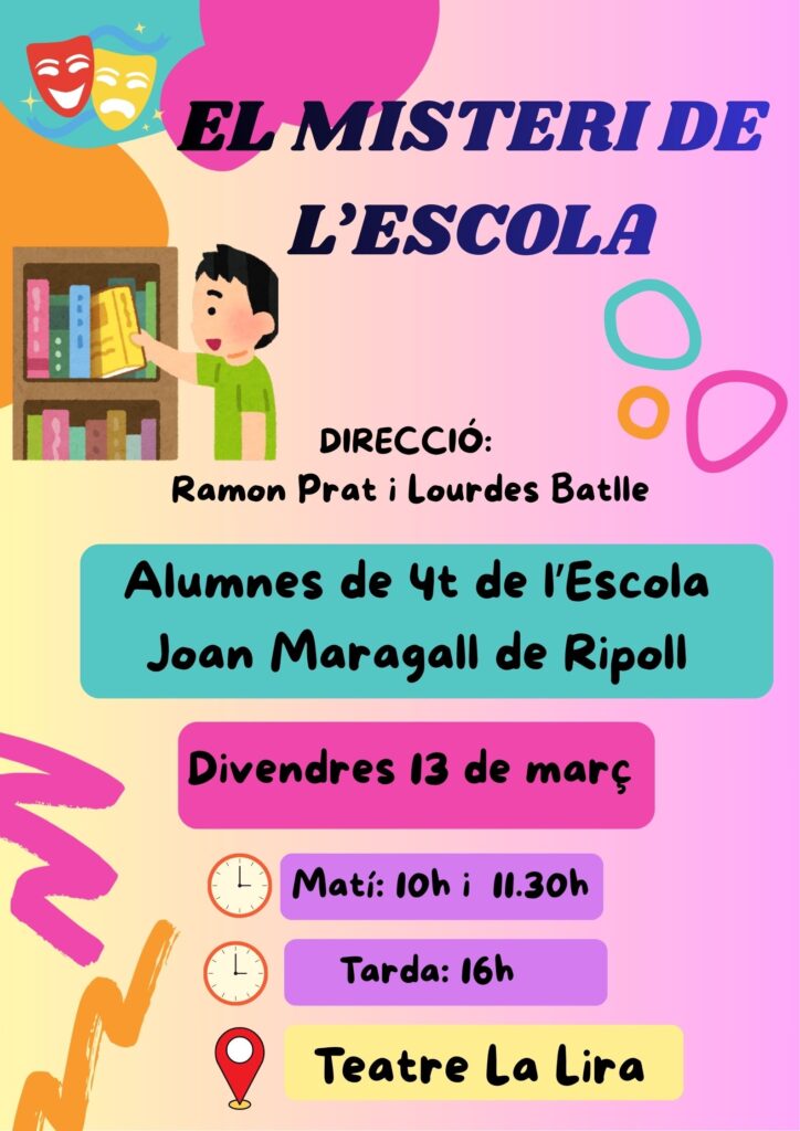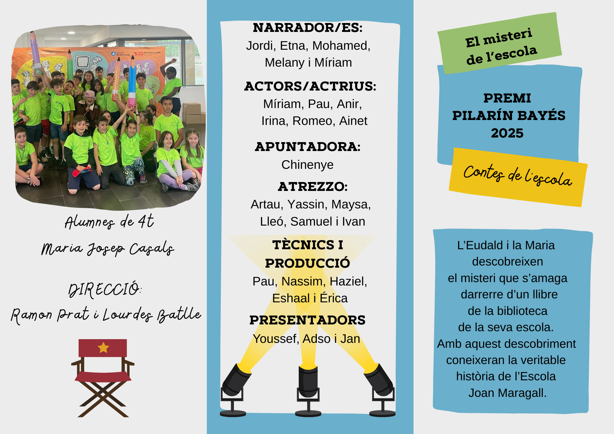 Aquest passat divendres, l’alumnat de 4t de la nostra escola ha escenificat en una obra de teatre el conte “El misteri de l’escola”. Aquest conte va ser escrit en grup pel mateix alumnat el curs passat i va rebre el Premi Pilarín Bayés.
