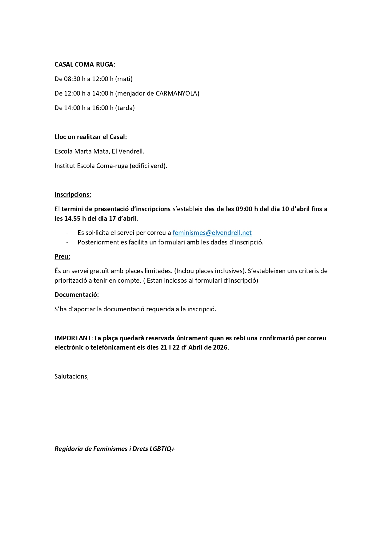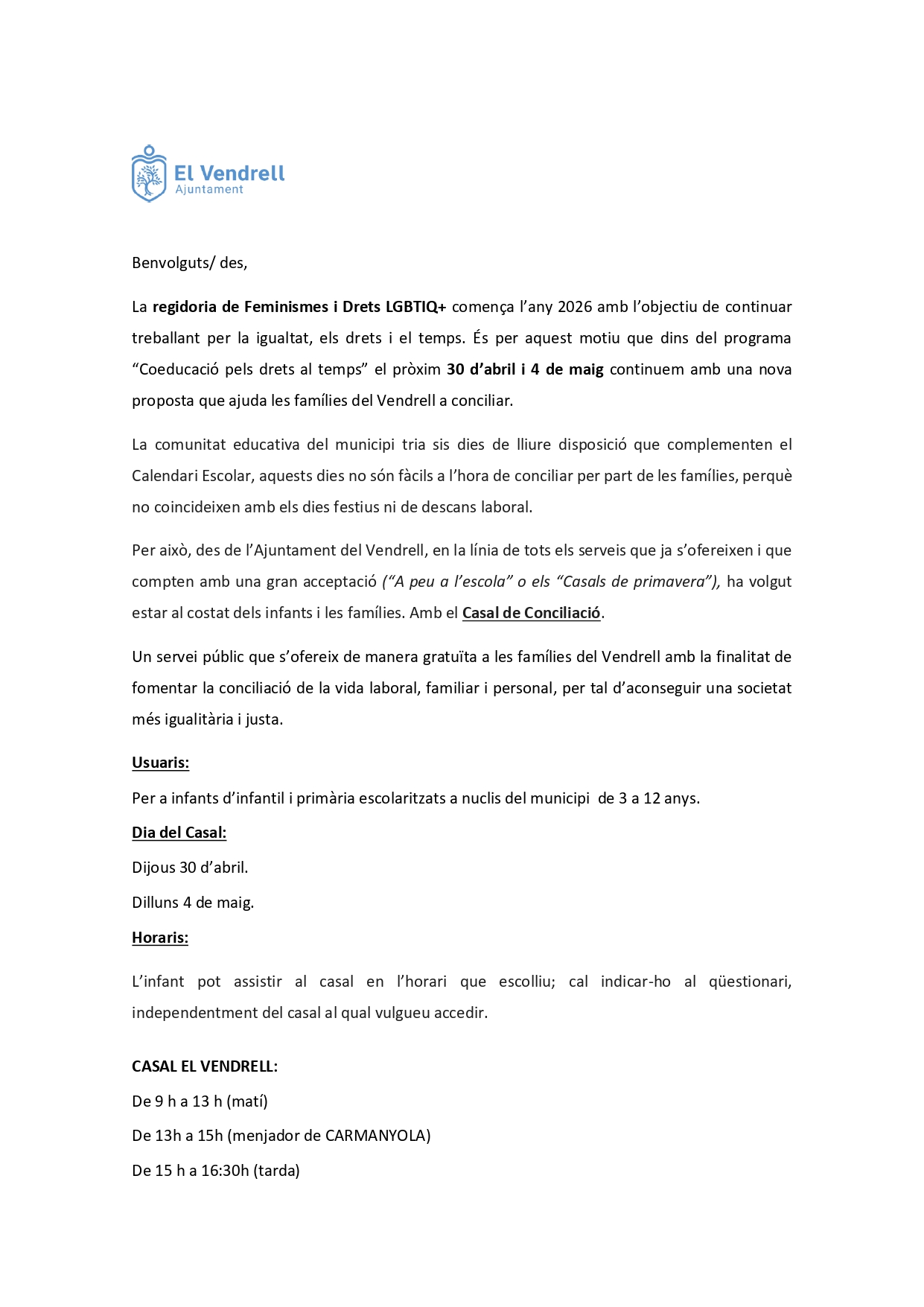 Des de l’Ajuntament del Vendrell us fem arribar la següent informació, que pot ser del vostre interès: