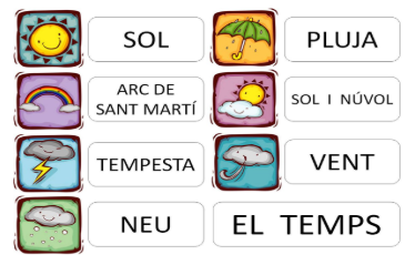 Després podeu fer un dibuix del temps que fa (en un full o pissarreta) i escriure-ho a sota: per exemple, si fa sol dibuixem un sol i a sota escrivim “sol”).