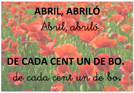 Podeu explicar als nens/es que ha començat el mes d’abril i fer una conversa de les coses que passen durant aquest mes (si hi ha l’aniversari d’algun amic o familiar, que serà la pasqua, que els padrins porten la mona als seus fillols,…). Després els podeu dir que recitin la dita següent: