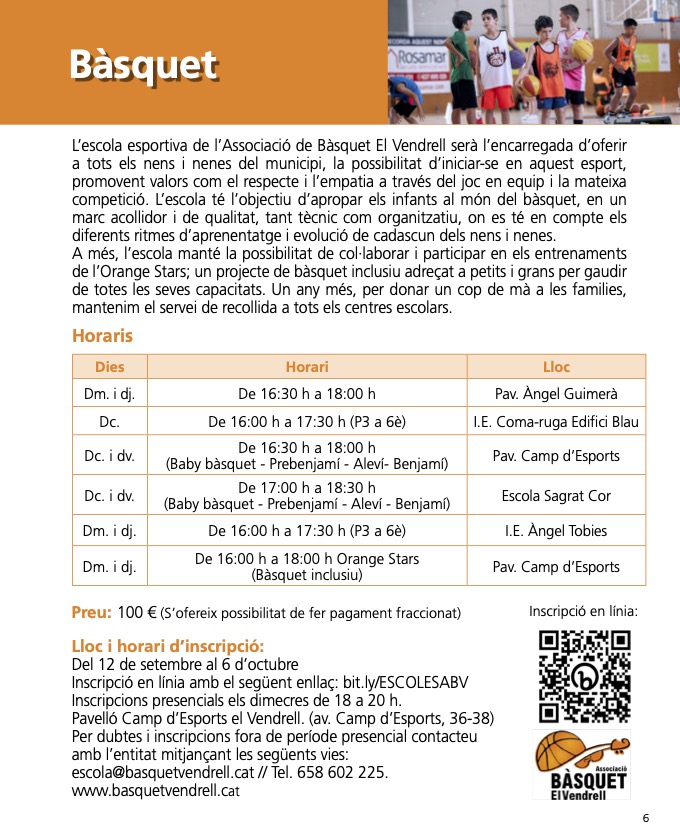 A continuació trobareu el díptic informatiu que ens ha fet arribar l’escola de bàsquet del Vendrell amb informació sobre el procés d’inscripció per a la temporada 2023-2024, per si és del vostre interès: