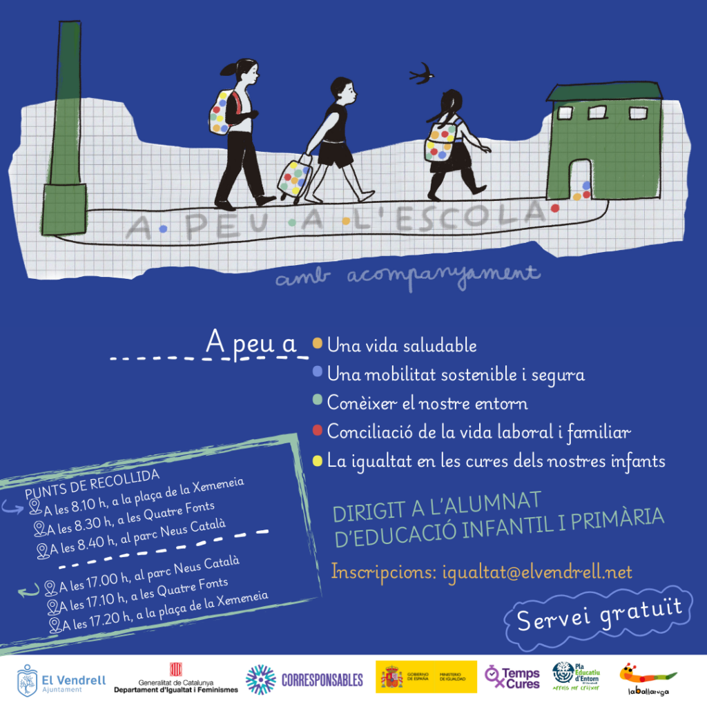 des de la regidoria de Feminismes de l’Ajuntament del Vendrell, dins del programa Temps x Cures, amb la col·laboració del Pla Educatiu d’Entorn ens han informat que, a partir de demà, dia 12 de desembre, s’inicien les inscripcions del 2on trimestre de “A peu a l’escola”