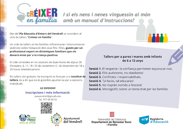 La propera setmana s’inicia l’edició dels tallers formatius Créixer en família d’aquest curs, organitzat pel Pla Educatiu d’Entorn del Vendrell. En aquesta ocasió els tallers són adreçats a famílies amb filles i fills de 6 a 12 anys i tractaran sobre com educar en positiu. Les famílies reflexionaran i intercanviaran vivències sobre l’educació de les seves filles i fills, guiats per la Neus Reixach, formadora i experta en dinàmiques familiars que donarà eines per a la criança positiva.