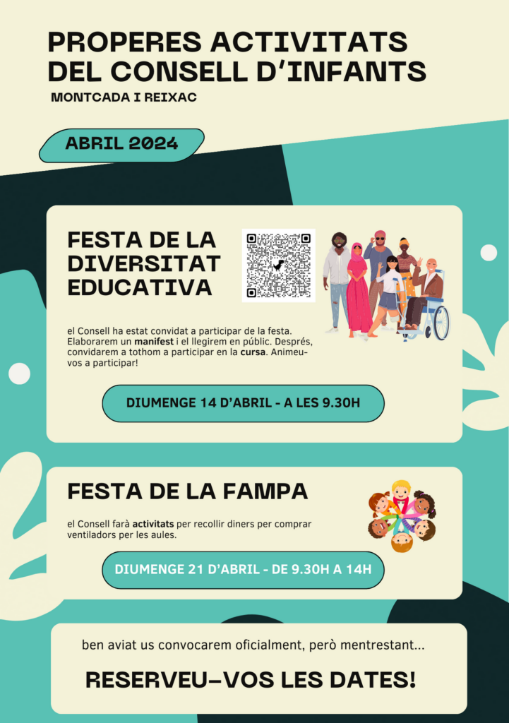 Des del Consell d’Infants ens conviden: Diumenge 14 d’abril: lectura del manifest del Consell d’Infants en el marc de les Jornades per la Diversitat Educativa 2024. • De 9.30h a 11h aprox. • Davant del pavelló Miquel Poblet • Després de la lectura del manifest podeu participar de la Cursa per la Diversitat Educativa! Diumenge 21 d’abril: participació de les activitats del