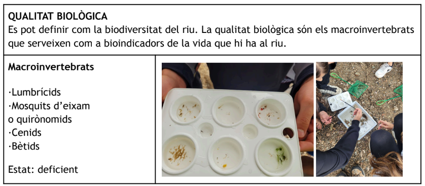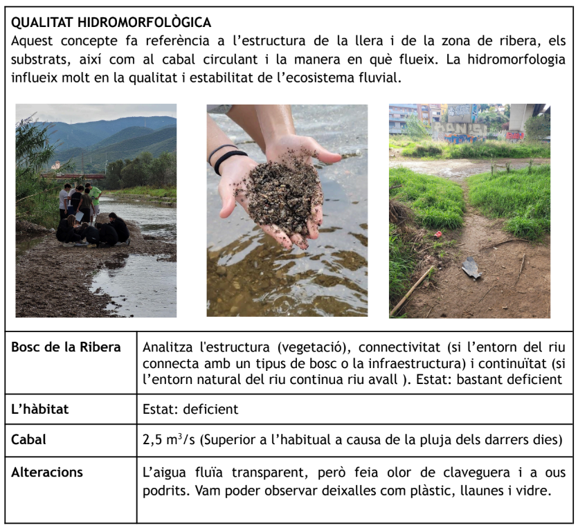 En conclusió, la qualitat del tram del riu que hem analitzat era deficient. Aquesta situació creiem que es deu a la proximitat d’urbanitzacions, carreteres i vies de tren, que alteren l’ecosistema natural i perjudiquen les espècies que hi viuen i la qualitat de l’aigua.