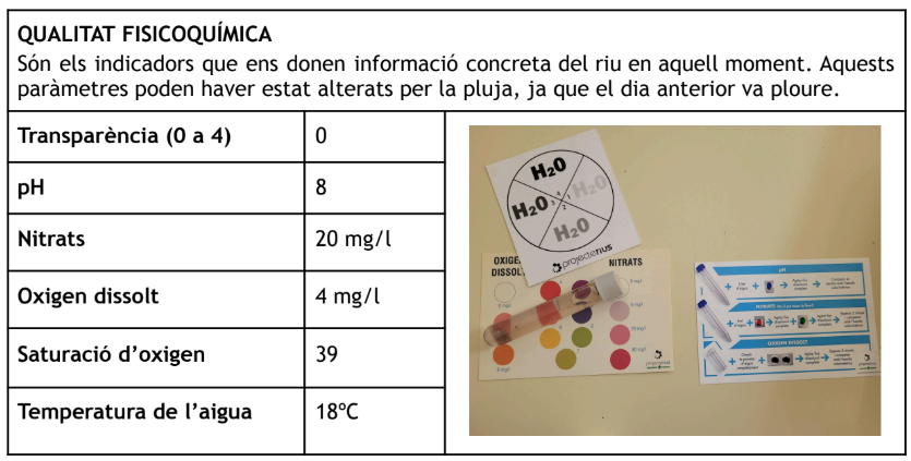 Aquest primer trimestre l’alumnat de 3r d’ESO de l’Institut Escola Mas Rampinyo s’han presentat com a voluntaris en aquest projecte. A continuació es mostren les dades i resultats més rellevants de l’anàlisi del riu Ripoll en un tram de Montcada i Reixac: