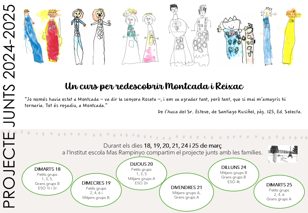 Com cada any, l’alumnat us anirà explicant les indagacions que han fet sobre el tema d’estudi. L’exposició estarà oberta els dies 18, 19, 20, 21, 24 i 25 de març. Infantil i primària a partir de les 15:15 h i secundària a partir de les 14:45 h.