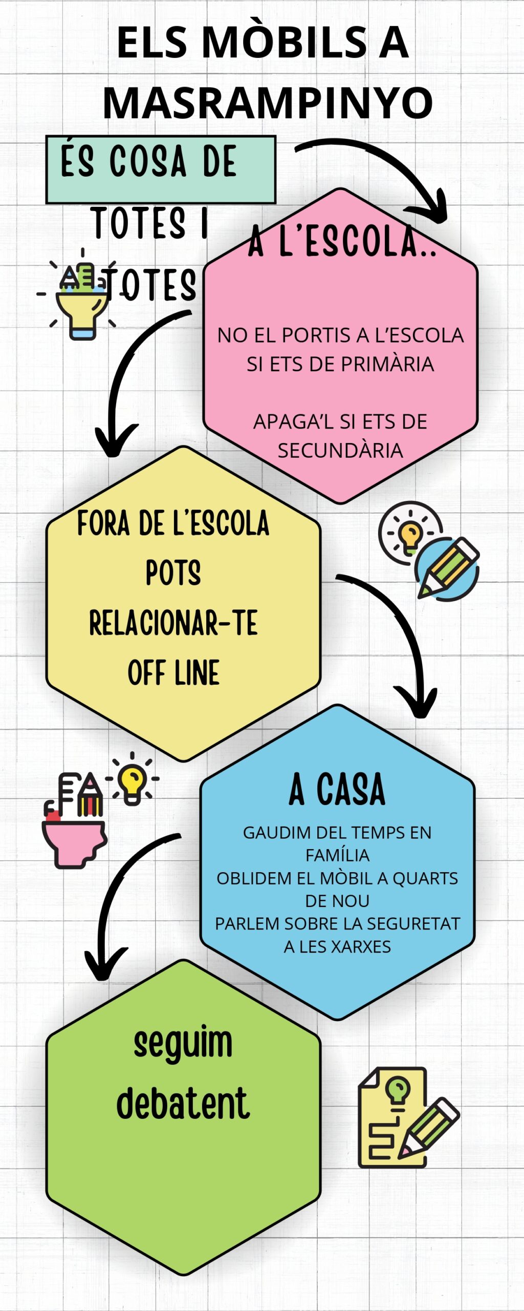 Dimarts 21 de novembre ens vam tornar a trobar per continuar el debat sobre l’ús dels mòbils. Un moment de reflexió amb famílies, alumnat i mestres que ens ajuda a avançar cap a un ús saludable, que afavoreixi l’autoimatge i compatible amb uns hàbits de vida positius.