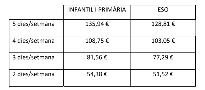 Els imports estan calculats per tal que tots els mesos siguin el mateix import i va comprès des de l’1 d’octubre fins al 30 de maig. ELS MESOS DE SETEMBRE I JUNY ES GIRARÀ UN REBUT AMB L’IMPORT DELS DIES REALS D’ÚS I ES COBRARAN TOTS ELS MESOS PER AVANÇAT.