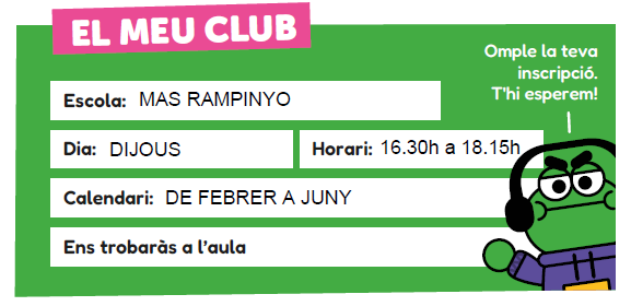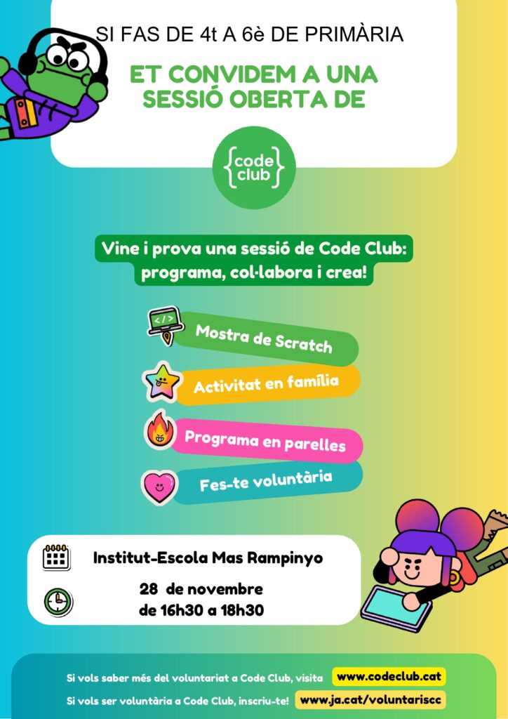 Us informem que el dia 28 de novembre a l’IE Mas Rampinyo tindrem una sessió oberta de Code Club. L’horari de la sessió serà de 16h30 a 18h30. Estem convençudes que serà una oportunitat fantàstica perquè conegueu el programa i us animem a participar en la següent edició que començarà al mes de febrer de 2025. Restem a la vostra disposició per qualsevol