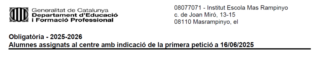 Preinscripció. Llistats places assignades i d’espera. Curs 2025-2026