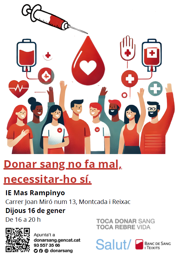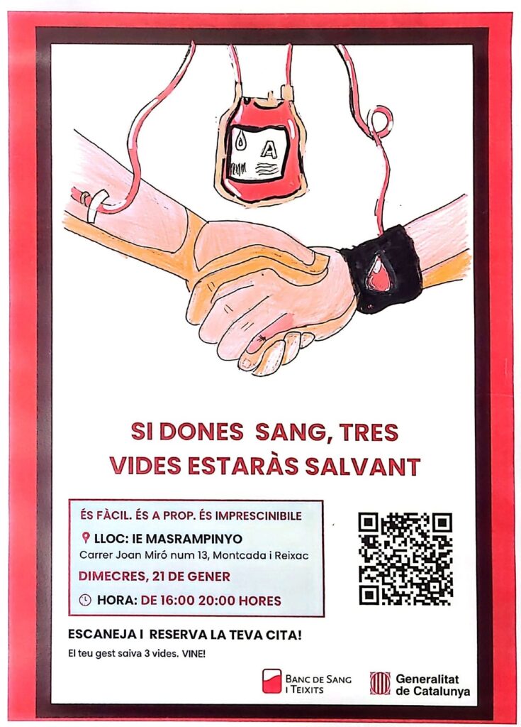 Dimecres 21 de gener tindrà lloc la donació de sang anual que organitza l’alumnat del servei comunitari de 3r d’ESO al gimnàs. Guardeu-vos el dia, us animem que vingueu a salvar vides!