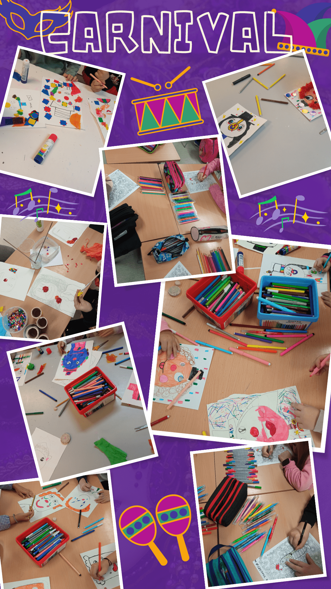 Amb l’arribada del rei Carnestoltes a l’escola, a la classe de plàstica els infants van dibuixar i decorar uns divertits pallassos. Cada alumne va posar la seva imaginació i creativitat i per aquest fet van sortir uns treballs plens de colors i alegria.