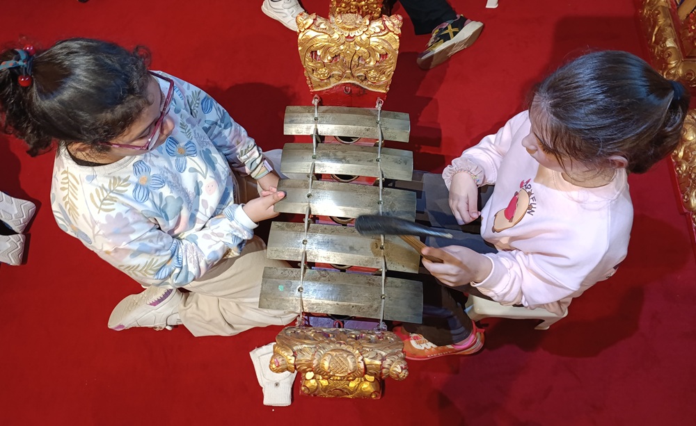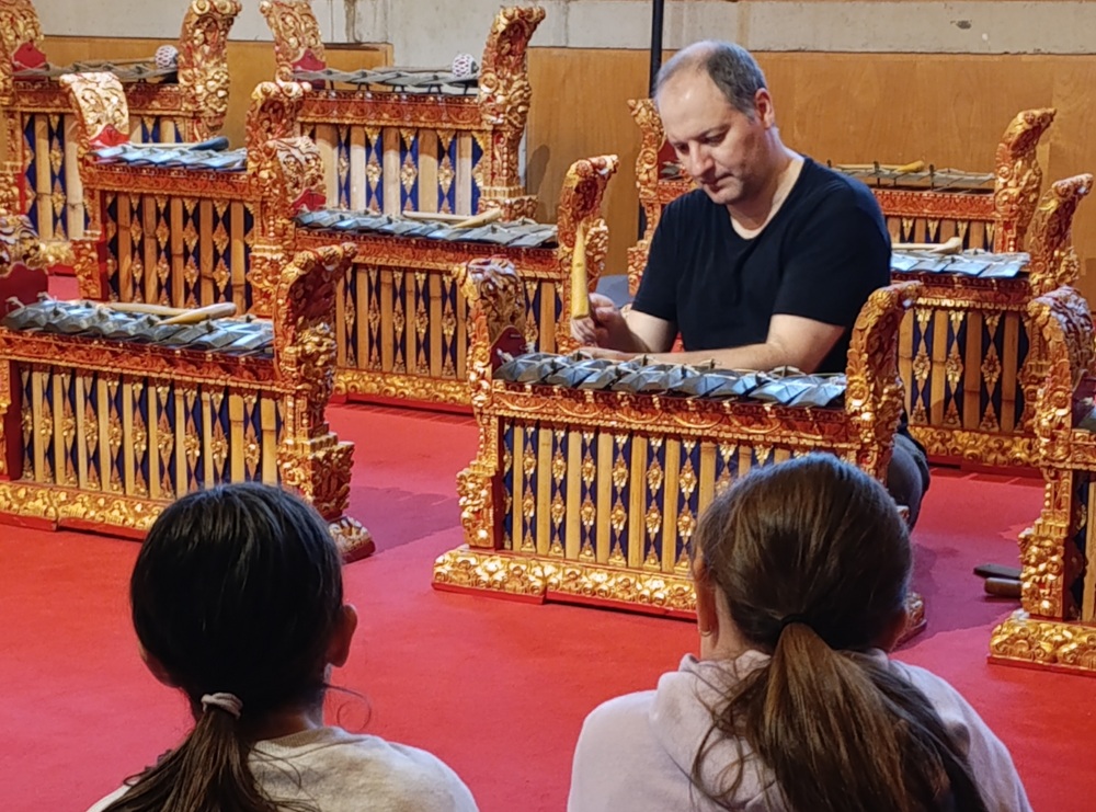 Després de la visita, els alumnes van participar en el taller “Voleu tocar el gamelan?”, on van conèixer i experimentar amb aquest conjunt instrumental tradicional d’Indonèsia, format principalment per instruments de percussió com metal·lòfons, gongs i tambors.