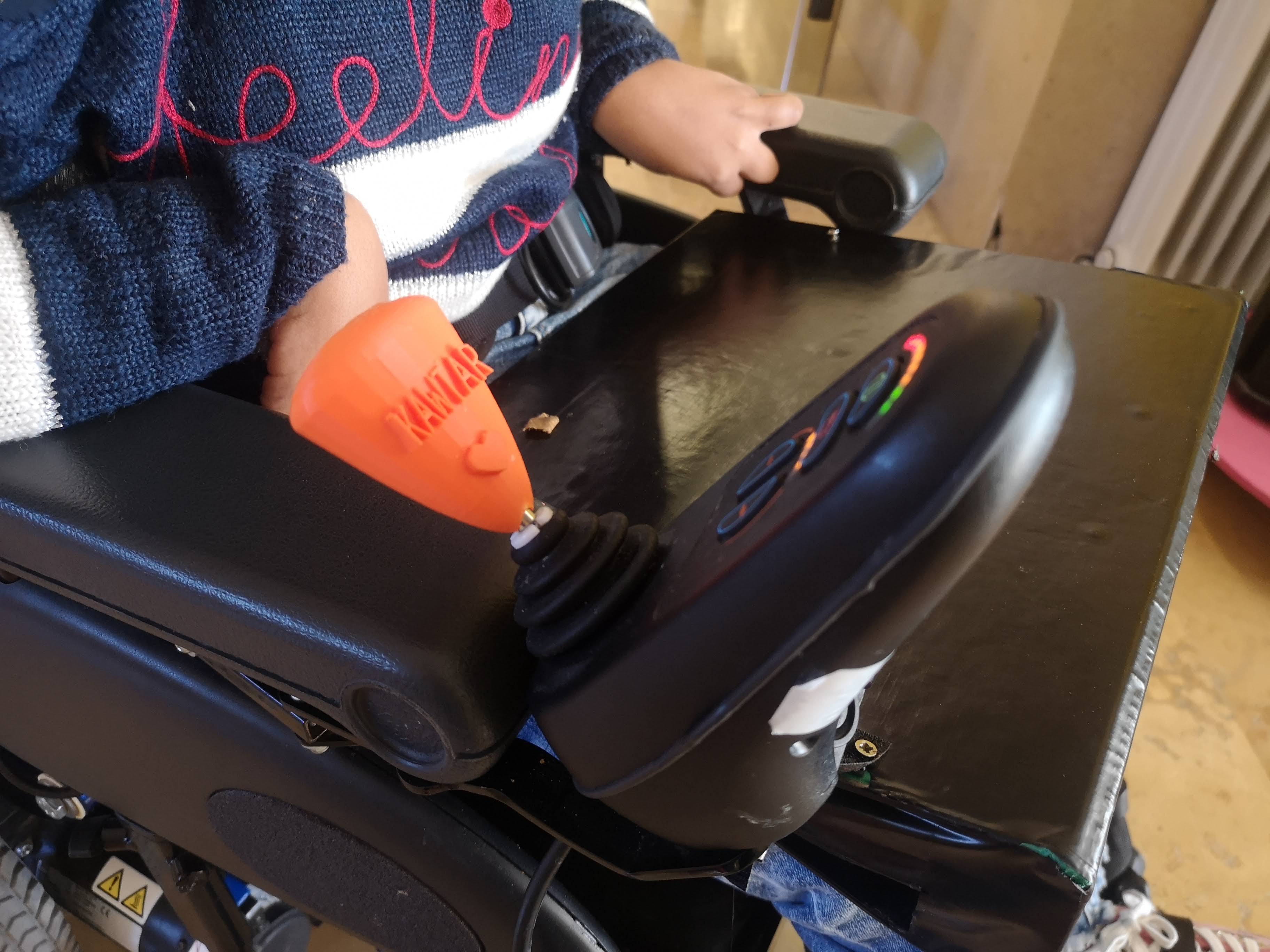 Un dels materials que hem creat ha estat un comandament per a una cadira de rodes electrònica. Hem aconseguit donar la forma, el tamany i l’orientació adequats per a les necessitats específiques d’una alumna, aconseguint una millora significativa en el control de la cadira per la seva part.