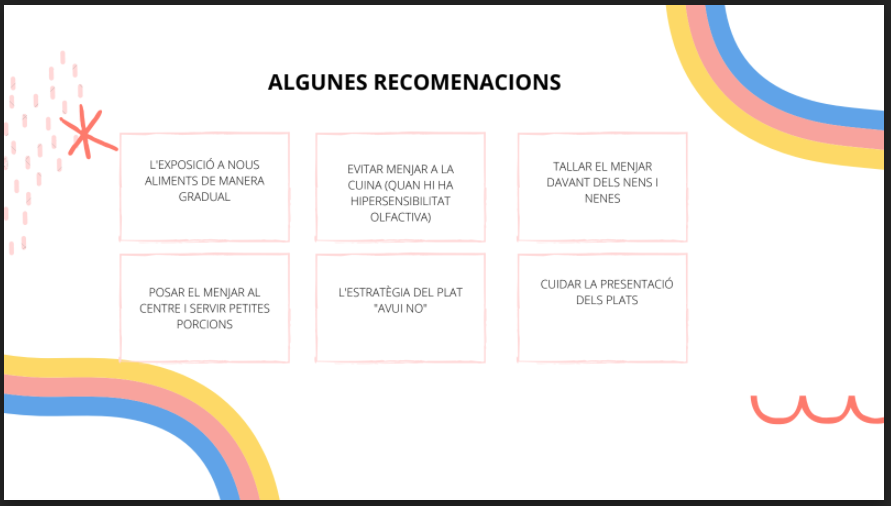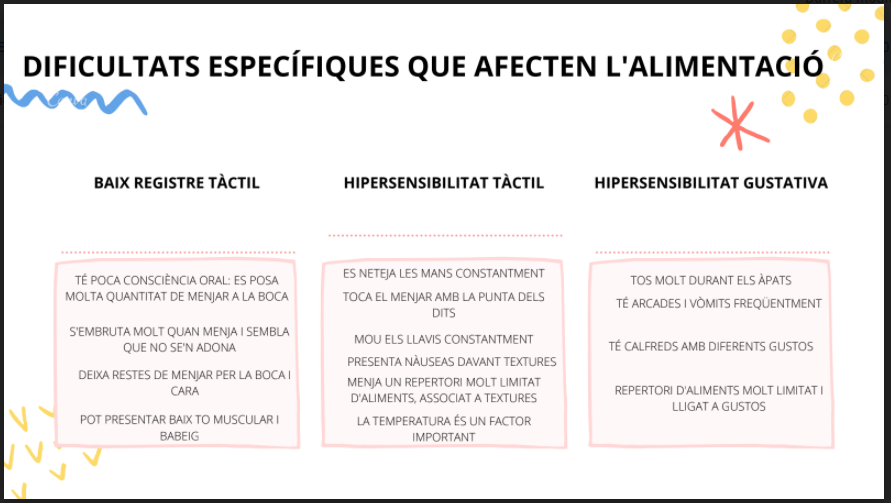 Per finalitzat Clàudia ha explicat com millorar l’alimentació quan hi han dificultats de processament sensorial, donant recomanacions i estratègies per aplicar en el dia a dia.