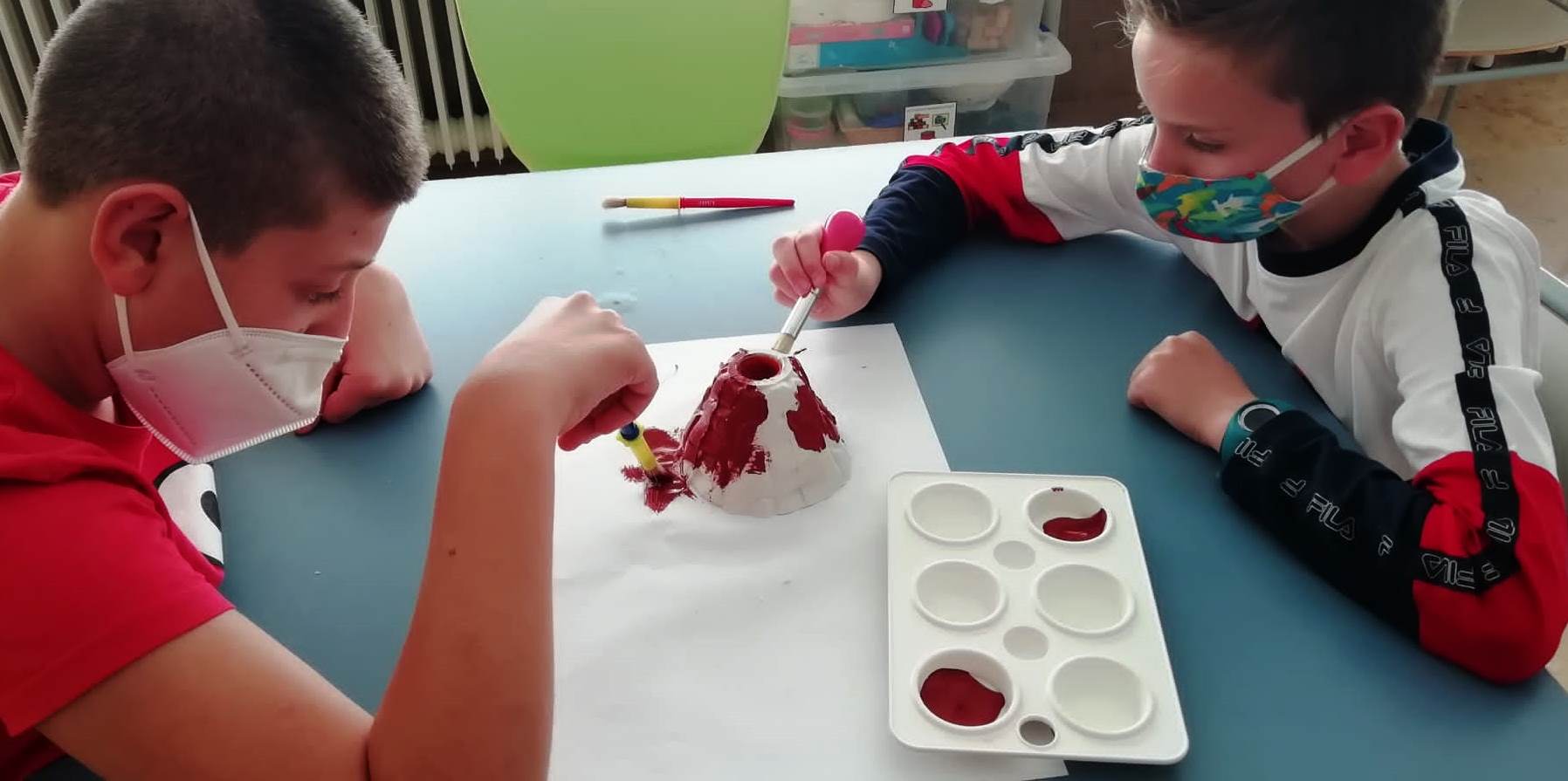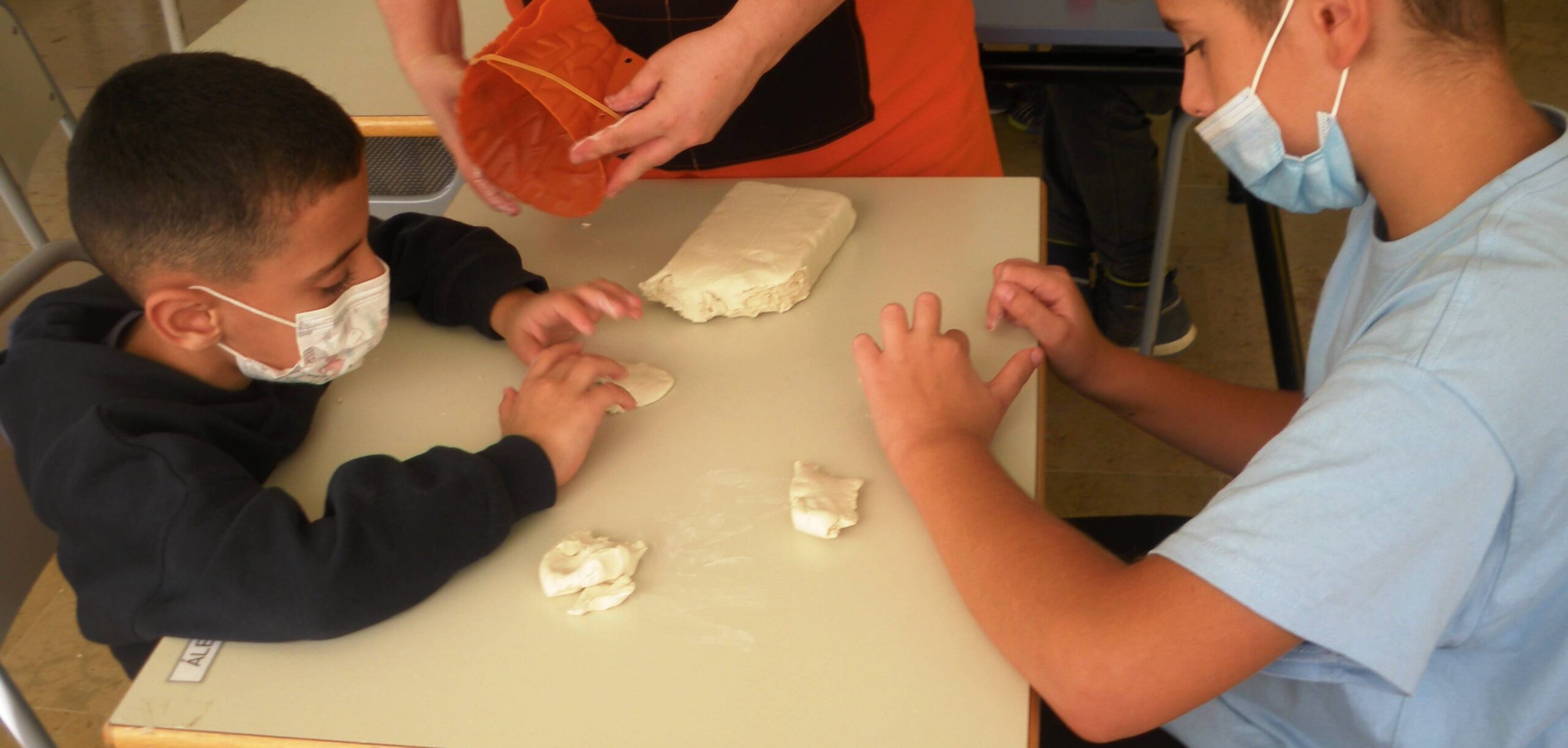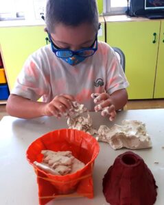 Així que acordem fabricar 4 volcans més. Rebem una ajuda inesperada, la de Carmelo i Laura, els fisios, que com ens han vist trafegar amb el guix amb pols a la classe, ens n’ofereixen del que tenen. Però quan ho provem, la seva escaiola s’endureix molt ràpid i no s’agafa correctament al motlle del volcà… Quina llàstima!! Finalment, la millor opció és elaborar-lo amb pasta blanca de modelar.