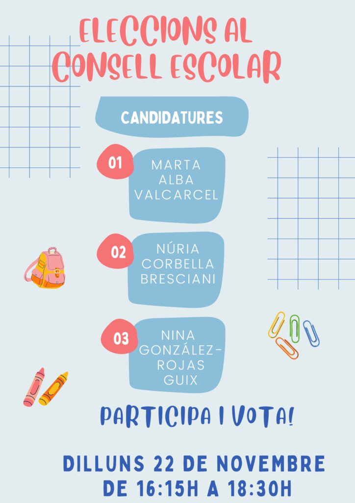17/11/21El proper dilluns 22 de novembre, al vestíbul de l’escola, de 16:15 a 18:30, totes les famílies esteu convocades per escollir les vostres representats al Consell escolar.