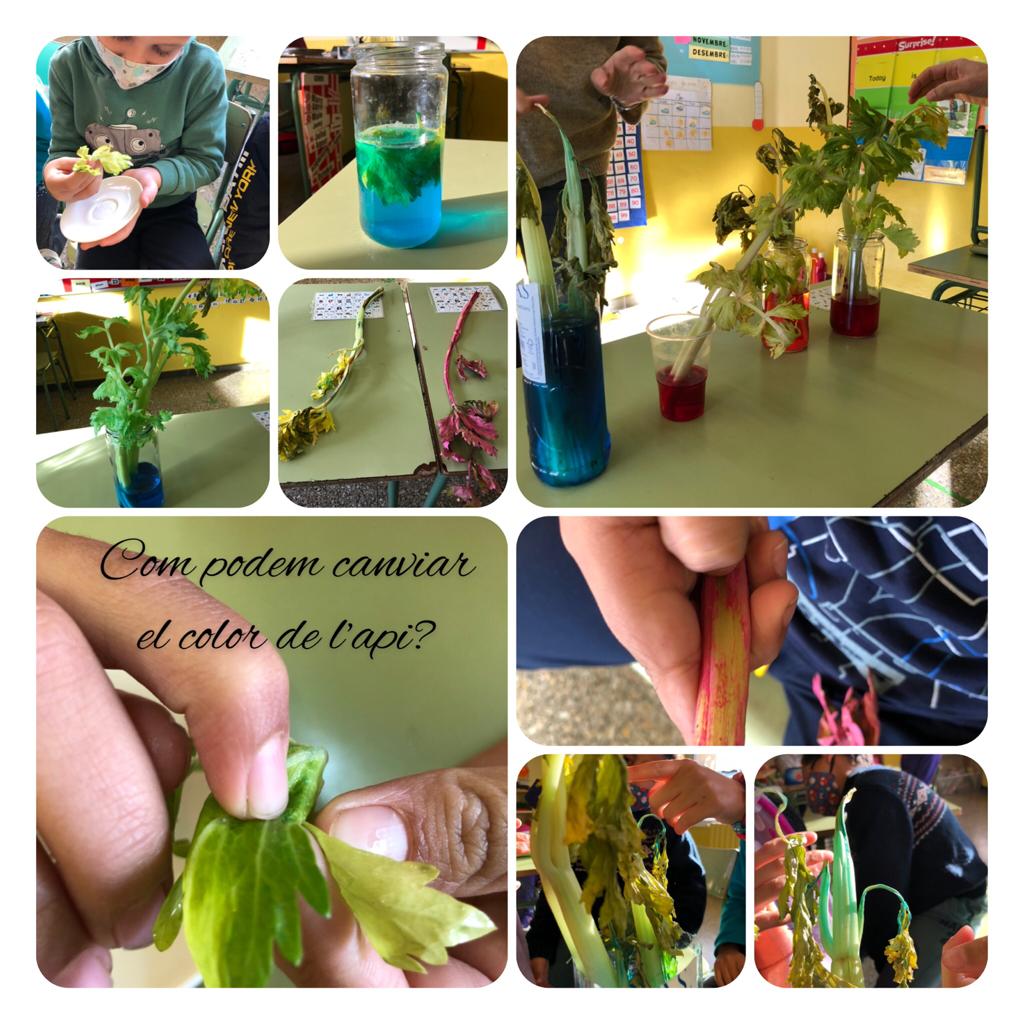 Els nens i les nenes de 1r i 2n vam fer un experiment perquè volíem saber com podíem canviar el color de l’api. Primer vam dir entre tots/es 4 hipòtesis: