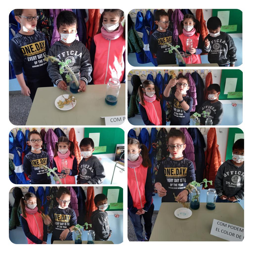 Entre tota la classe vam arribar a la conclusió que l’aigua amb colorant pujava per la tija i arribava a les fules.