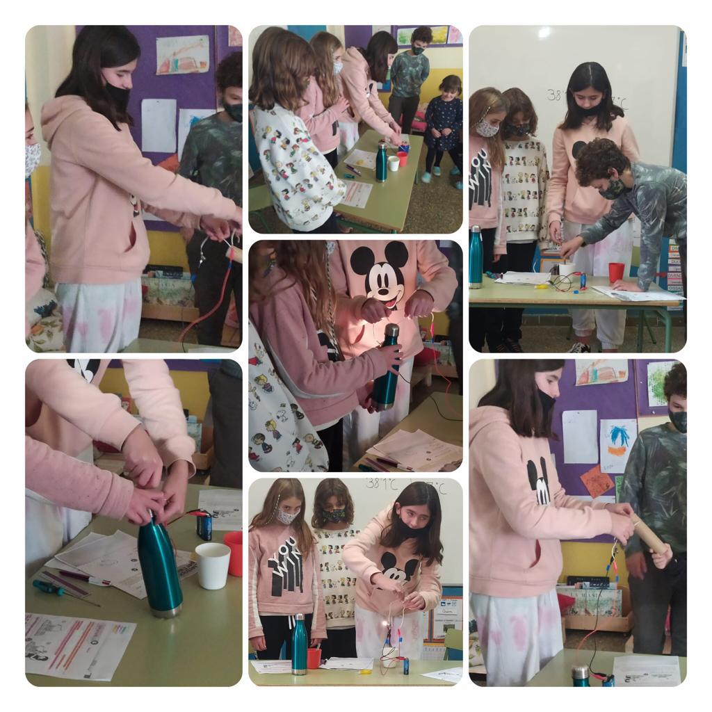 Els alumnes de cicle superior em creat un circuit elèctric amb una bombeta, una pila i cables.  Volem demostrar que el corrent elèctric pot passar per diferents materials conductor, i demostrar que l’aigua condueix l’electricitat i per què.