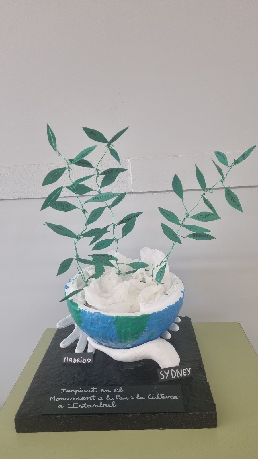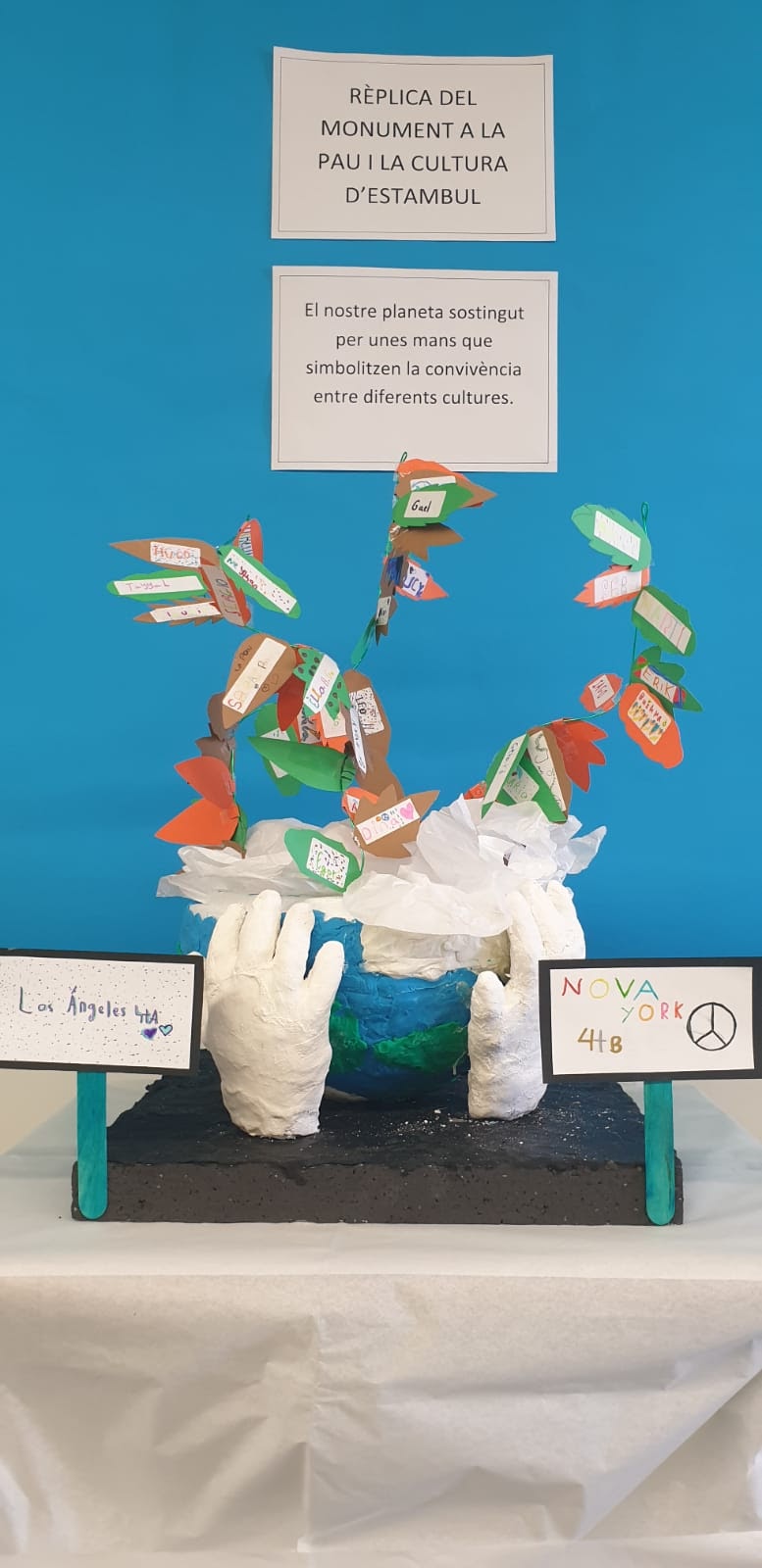 paper blanc i símbol de la pau representant les diferents cultures integrades a l’escola. Paraules en diferents idiomes i infants units per les mans, coronat amb el símbols de la pau internacionals.