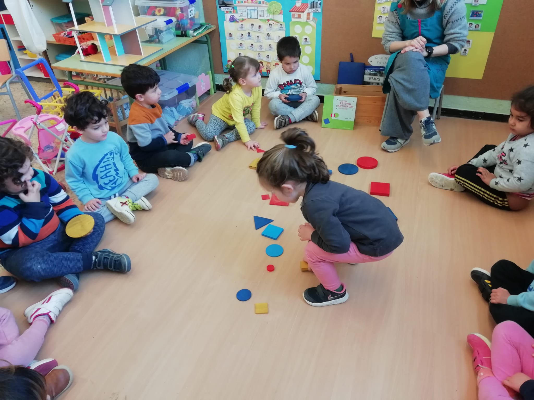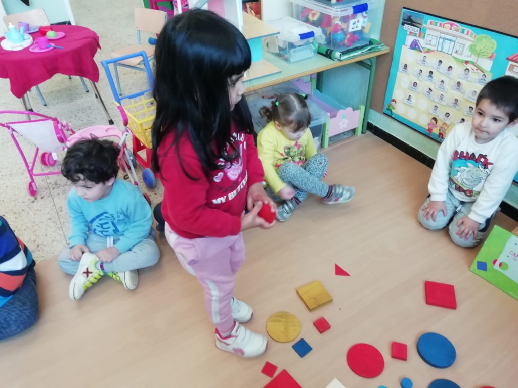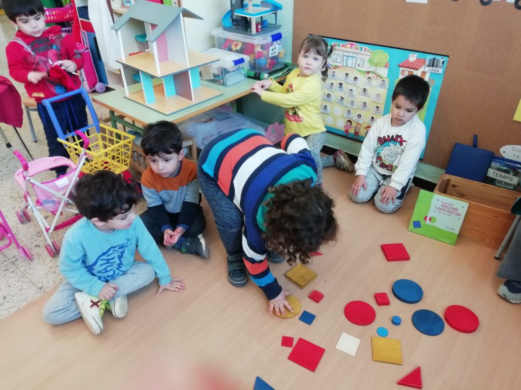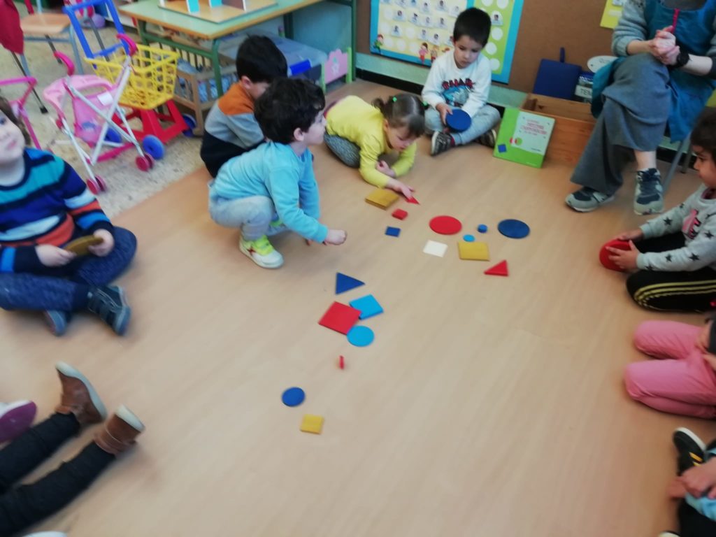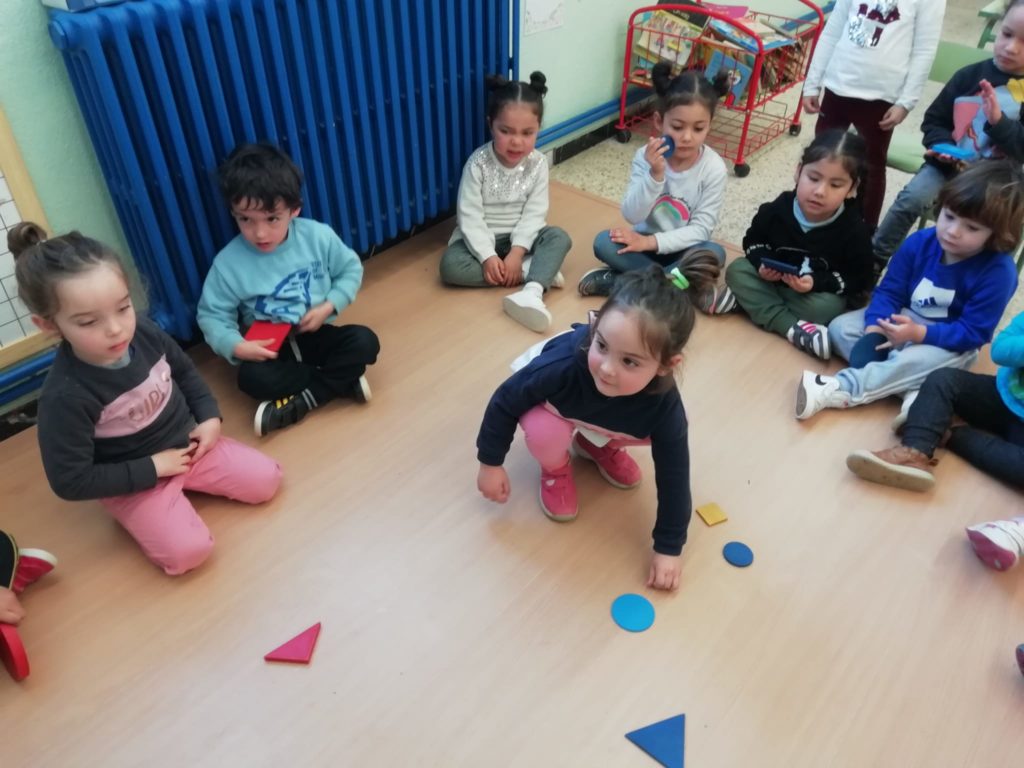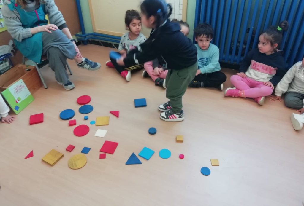 El vam convidar a la classe a través d’un conte preciós anomenat “Per quatre cantonades de no res”. Un cop vam escoltar aquest conte tan interessant que a més a més també treballa la diversitat, vam jugar amb les peces dels blocs lògics. La mestra ens anava dient consignes com “agafa un quadrat vermell petit…” Així rapissàvem altres formes geomètriques, la mida i els colors. I per últim anàvem recollint els blocs lògics per les formes 😊