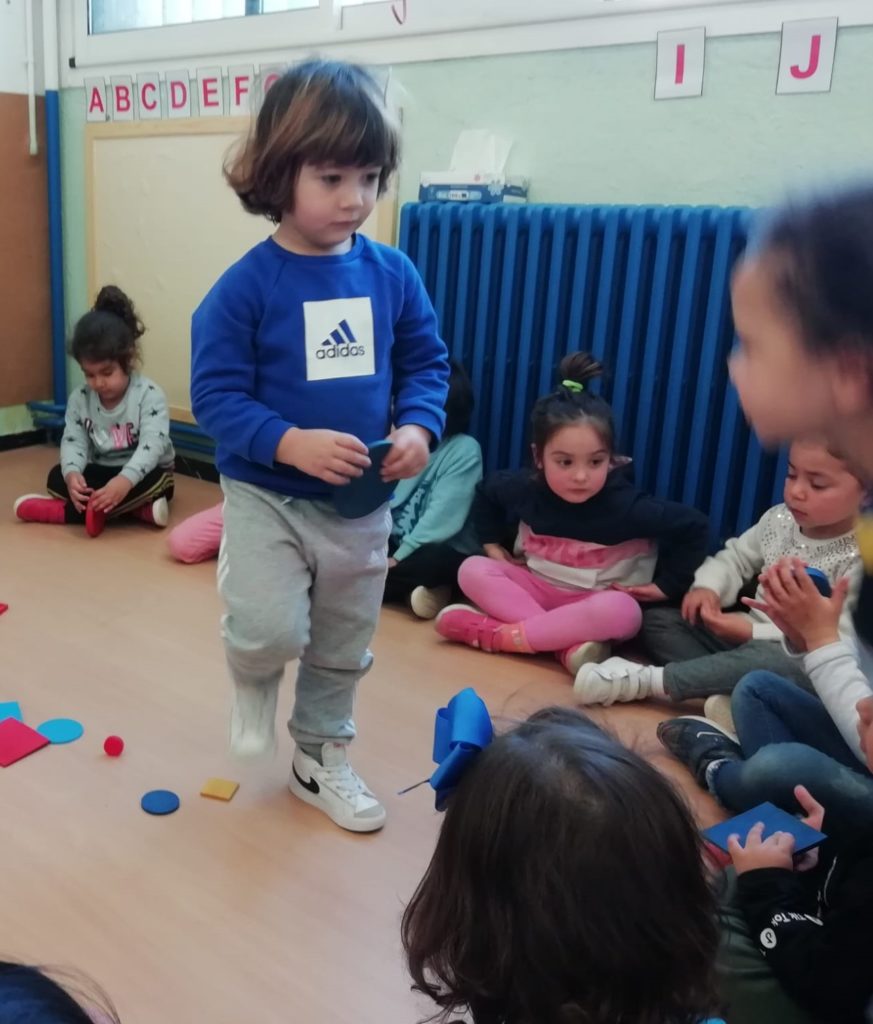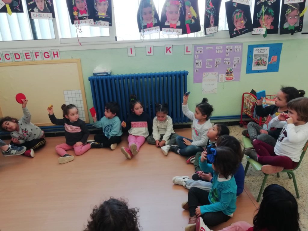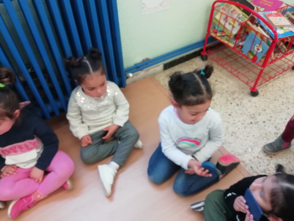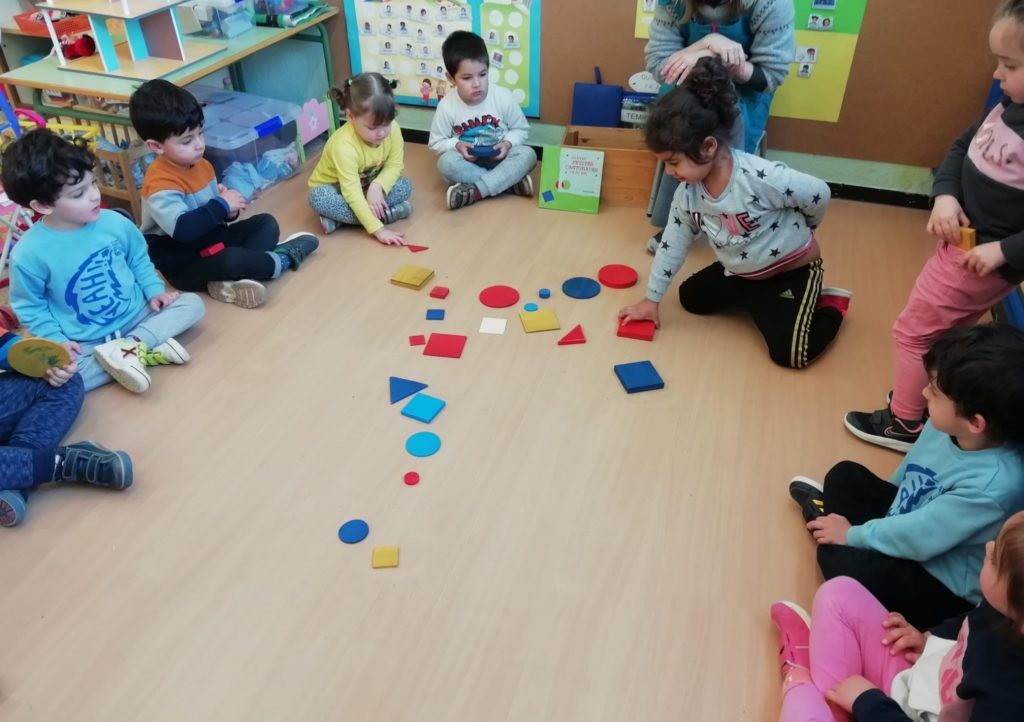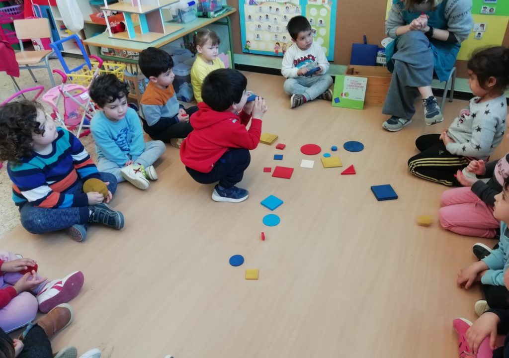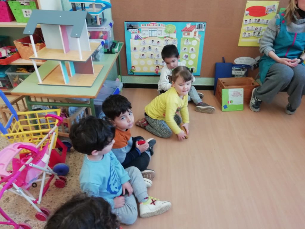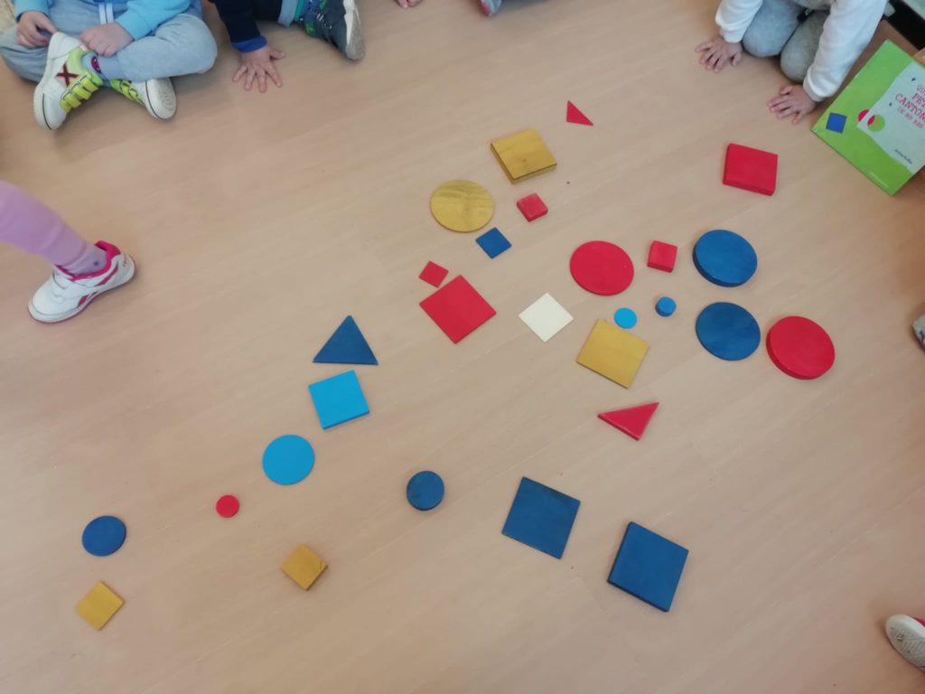 El vam convidar a la classe a través d’un conte preciós anomenat “Per quatre cantonades de no res”. Un cop vam escoltar aquest conte tan interessant que a més a més també treballa la diversitat, vam jugar amb les peces dels blocs lògics. La mestra ens anava dient consignes com “agafa un quadrat vermell petit…” Així rapissàvem altres formes geomètriques, la mida i els colors. I per últim anàvem recollint els blocs lògics per les formes 😊
