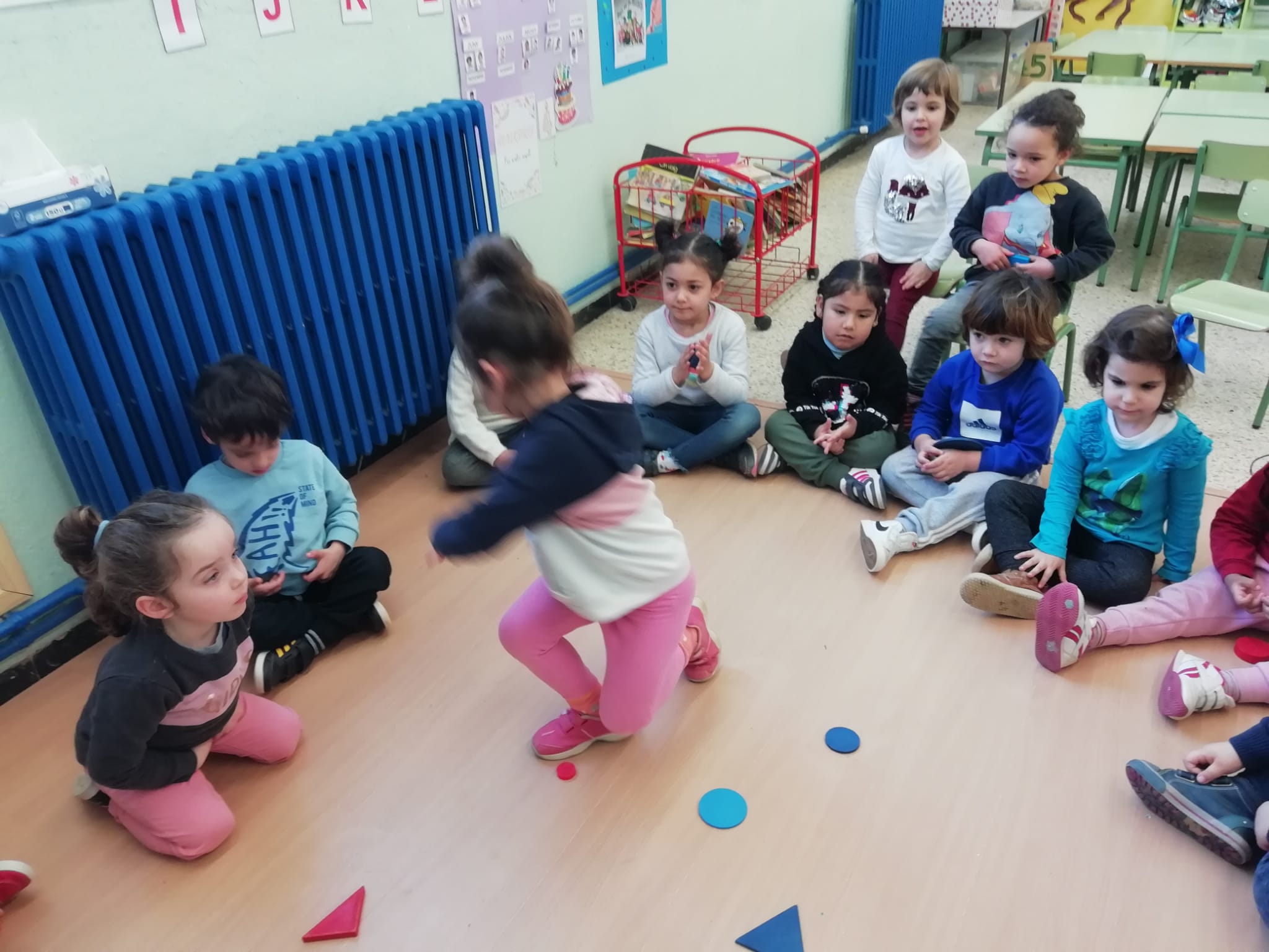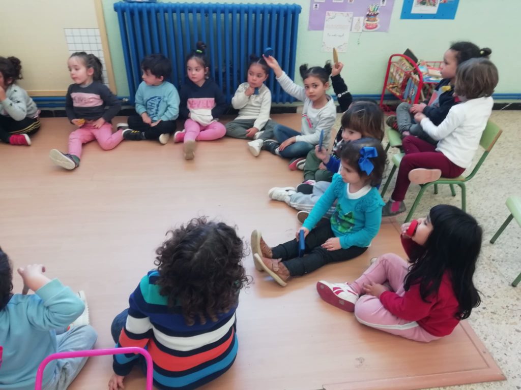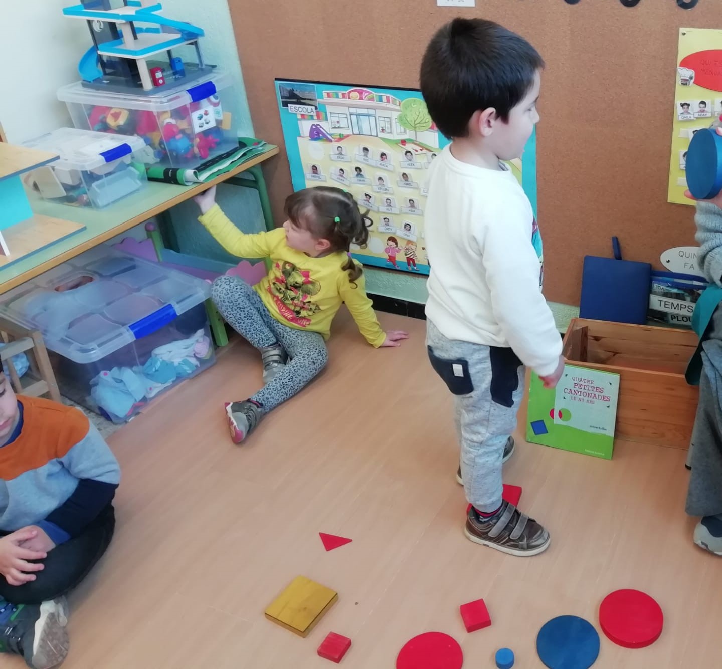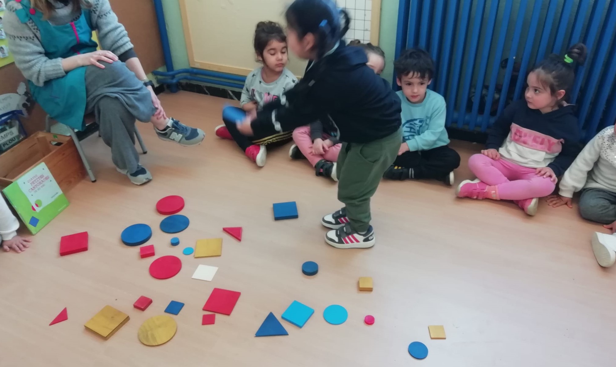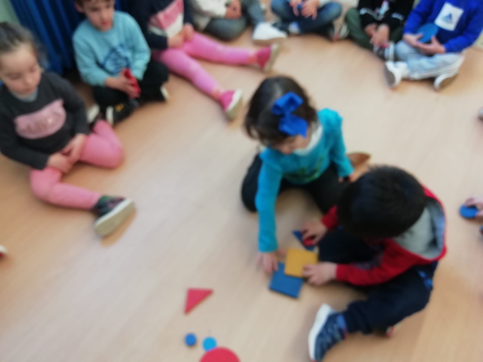 El vam convidar a la classe a través d’un conte preciós anomenat “Per quatre cantonades de no res”. Un cop vam escoltar aquest conte tan interessant que a més a més també treballa la diversitat, vam jugar amb les peces dels blocs lògics. La mestra ens anava dient consignes com “agafa un quadrat vermell petit…” Així rapissàvem altres formes geomètriques, la mida i els colors. I per últim anàvem recollint els blocs lògics per les formes 😊