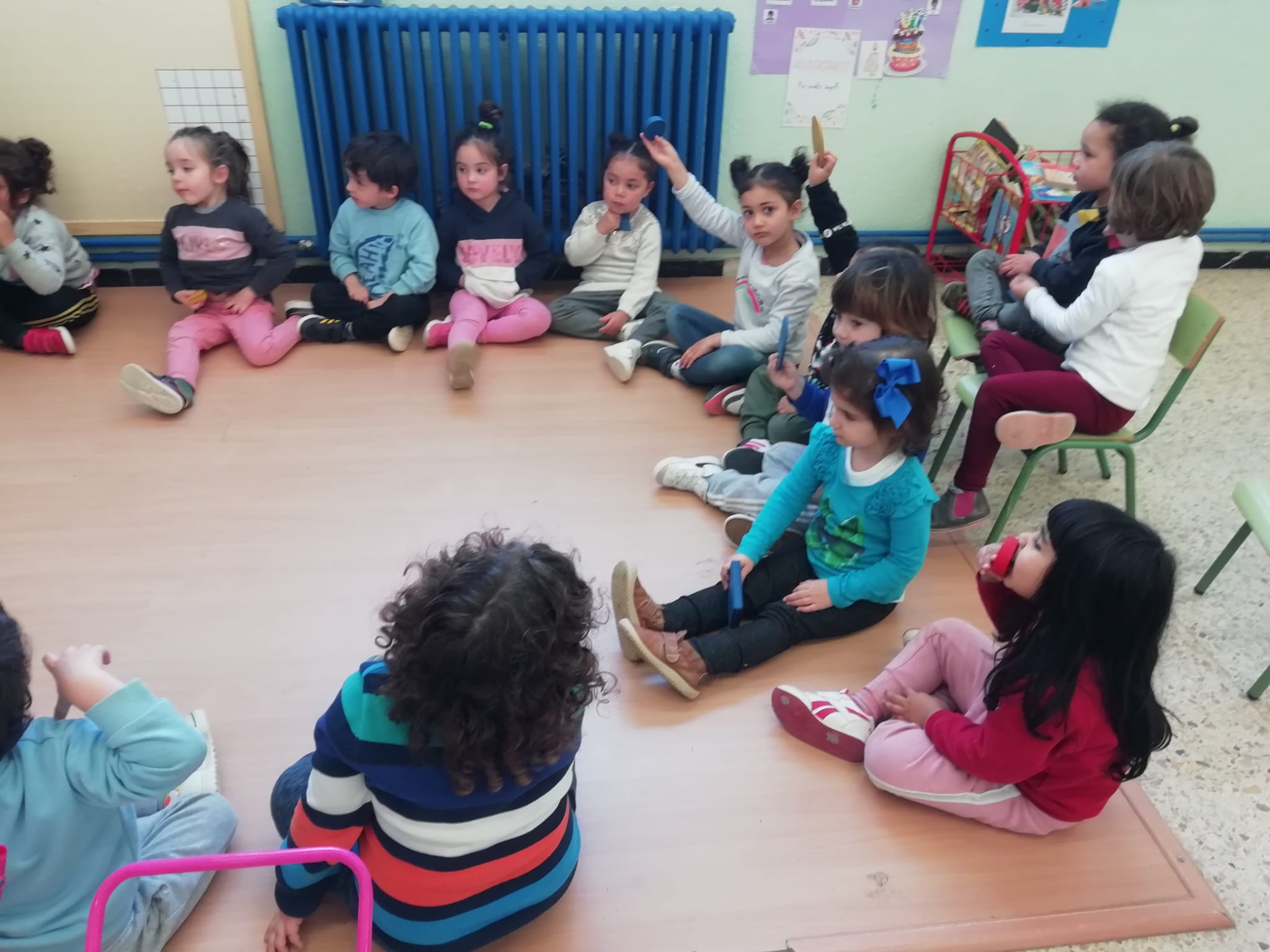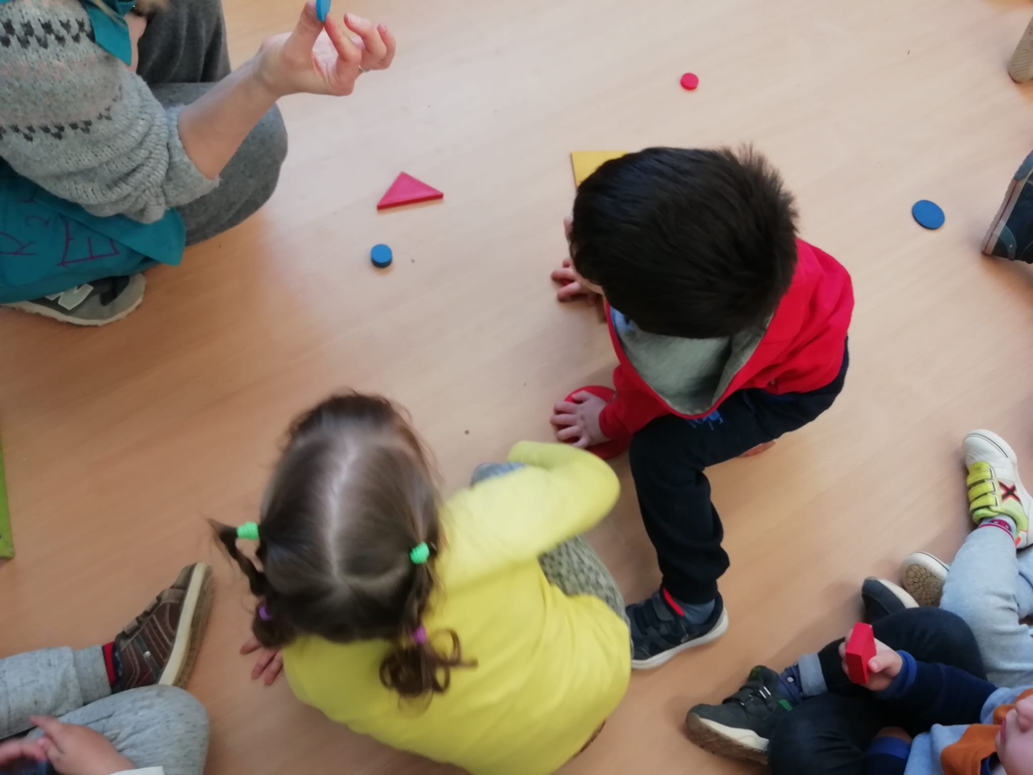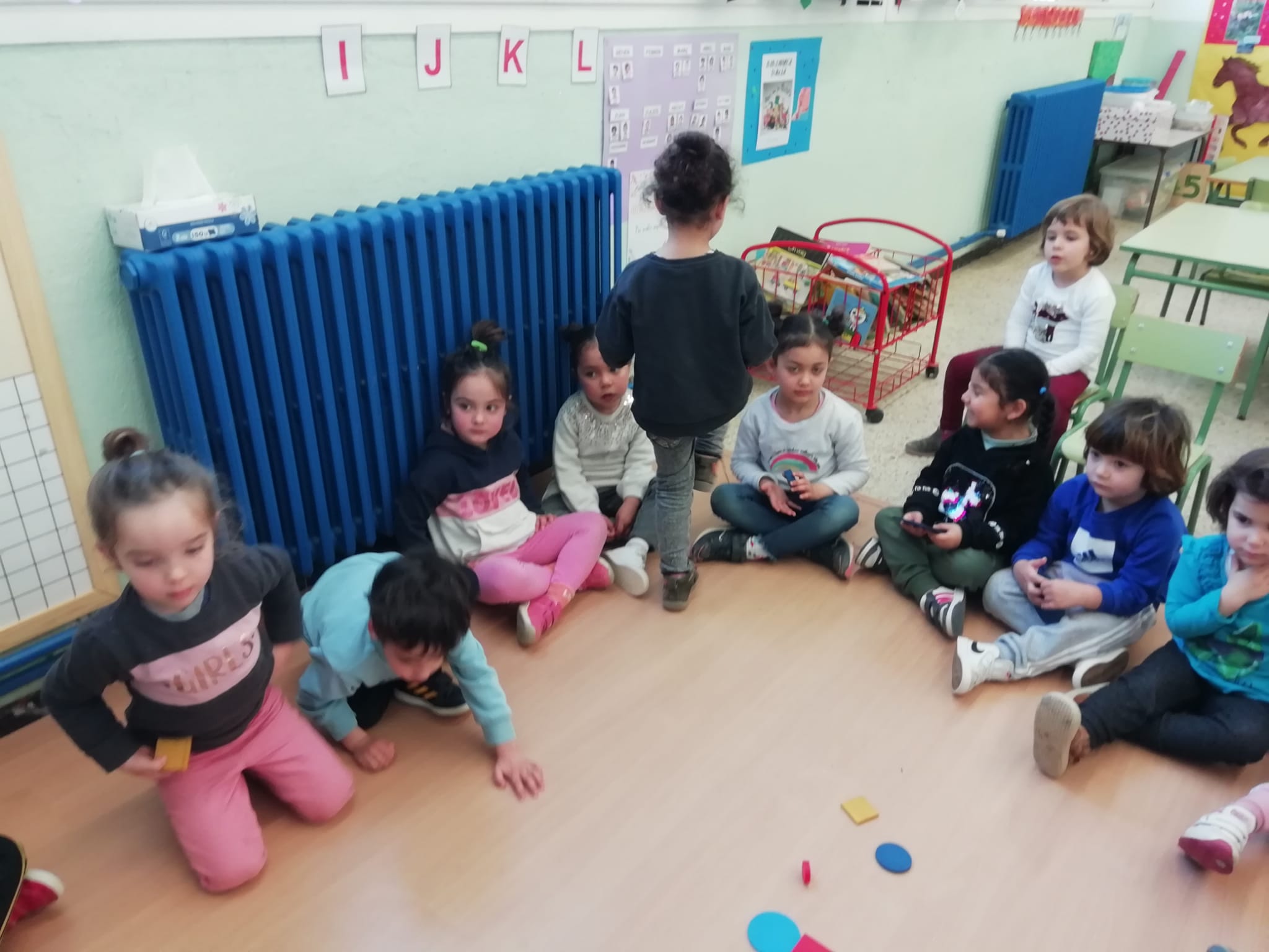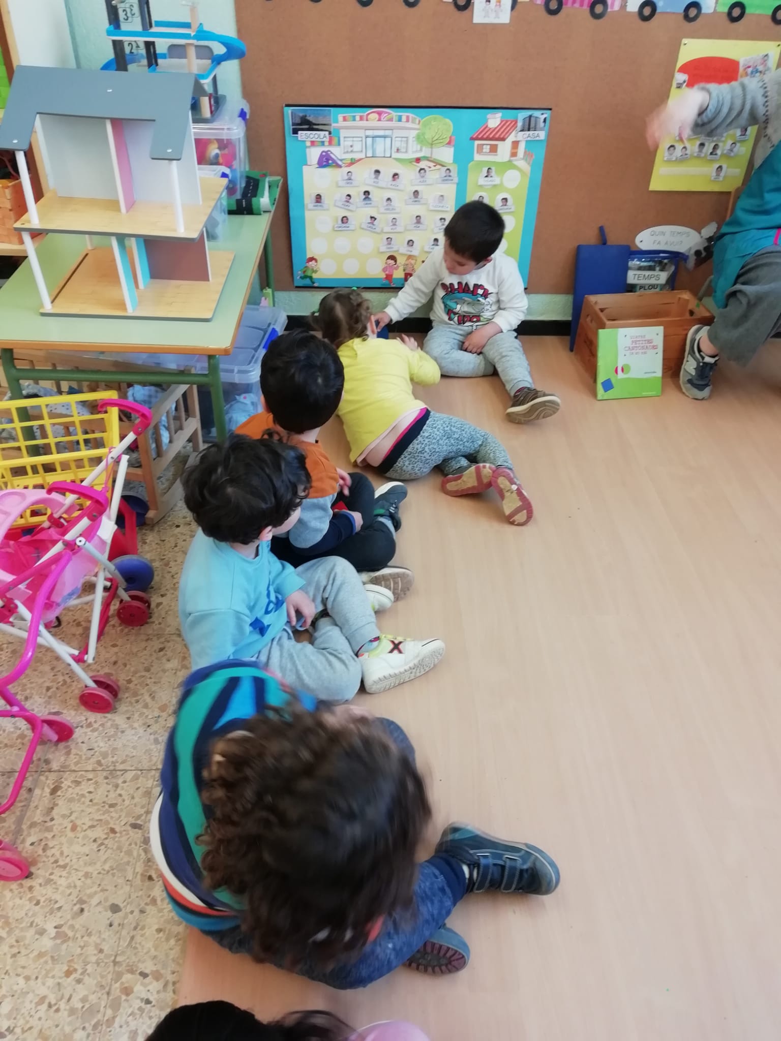 El vam convidar a la classe a través d’un conte preciós anomenat “Per quatre cantonades de no res”. Un cop vam escoltar aquest conte tan interessant que a més a més també treballa la diversitat, vam jugar amb les peces dels blocs lògics. La mestra ens anava dient consignes com “agafa un quadrat vermell petit…” Així rapissàvem altres formes geomètriques, la mida i els colors. I per últim anàvem recollint els blocs lògics per les formes 😊