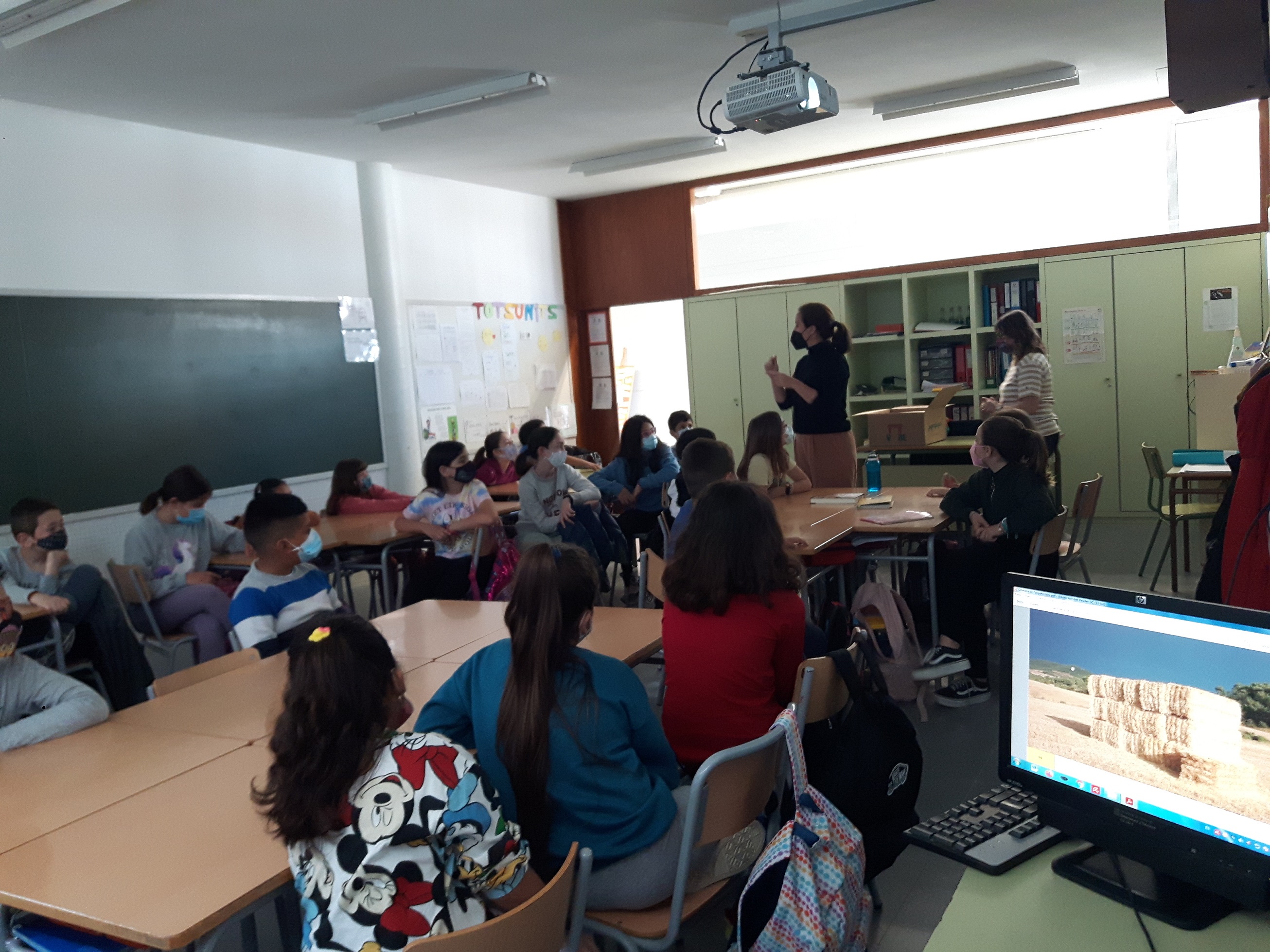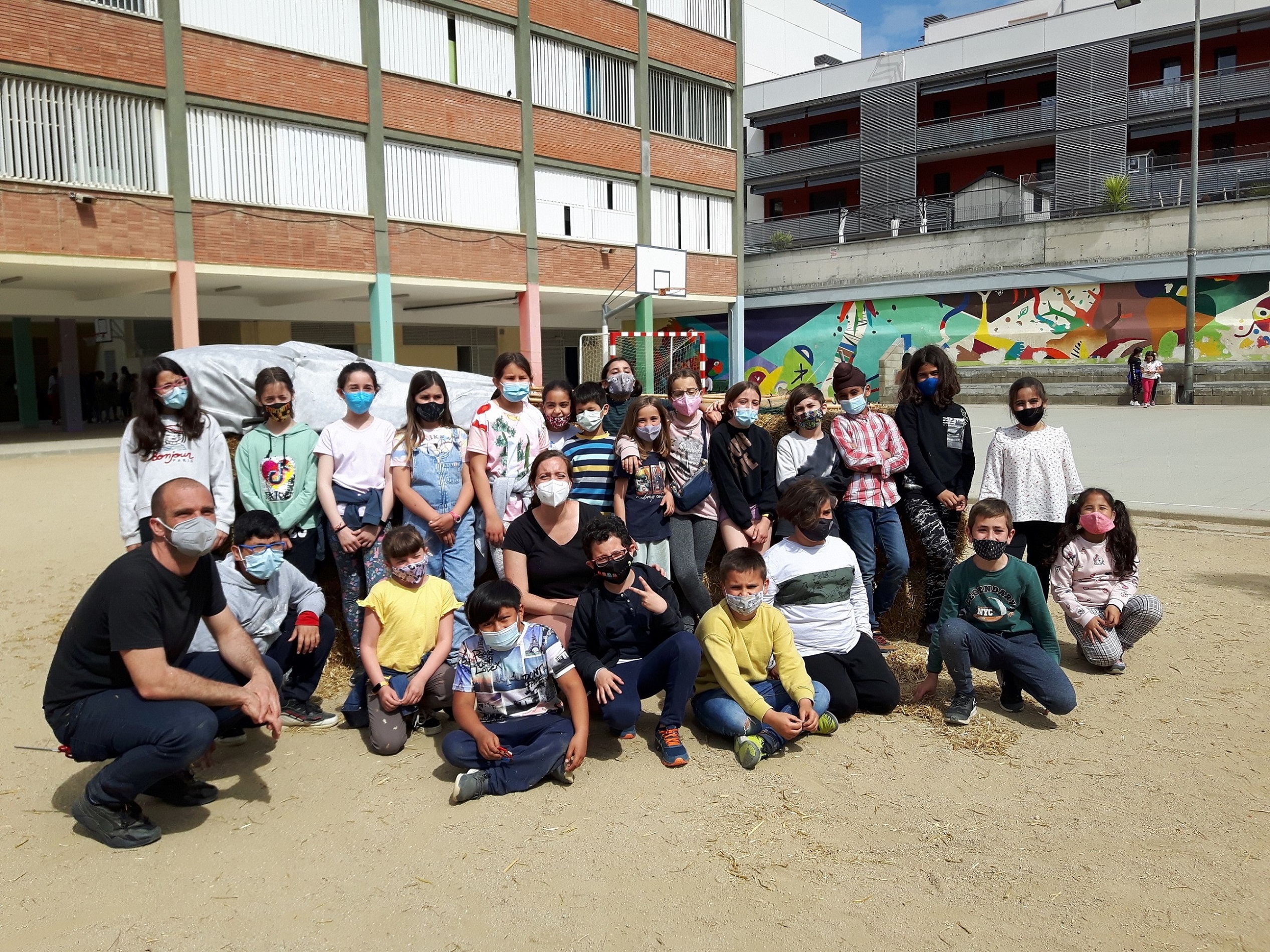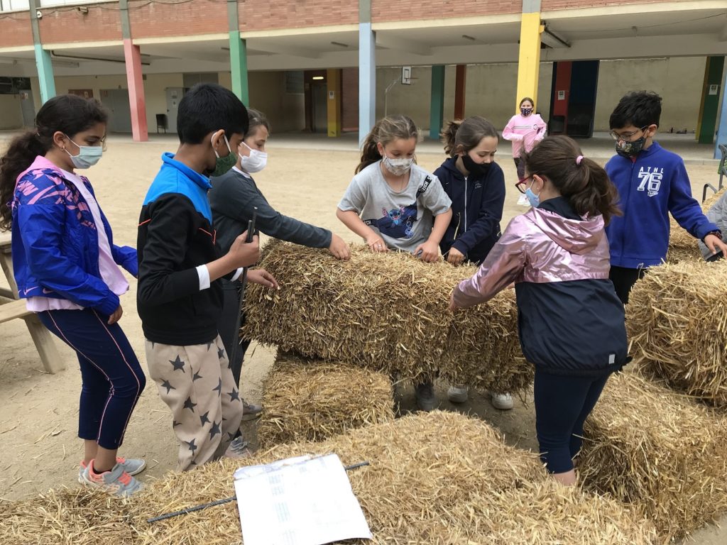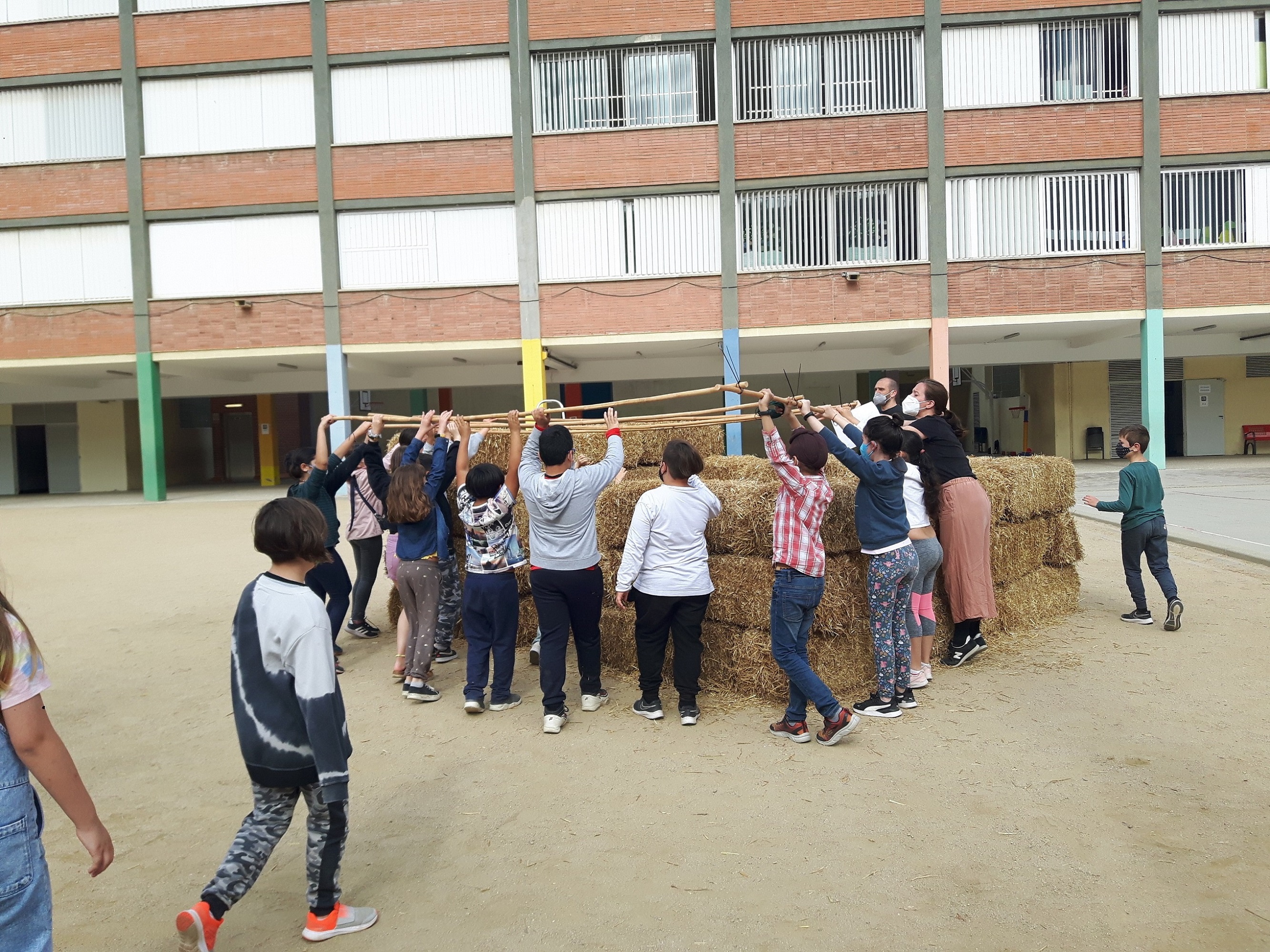Primer de tot, hem fet una sessió de disseny per preparar l’activitat: quin seria el nou element en el pati, on aniria, quina forma tindria i com es construiria. Hem practicat amb una maqueta del pati i amb unes peces que simulen bales de palla per fer una caseta de bales de palla.