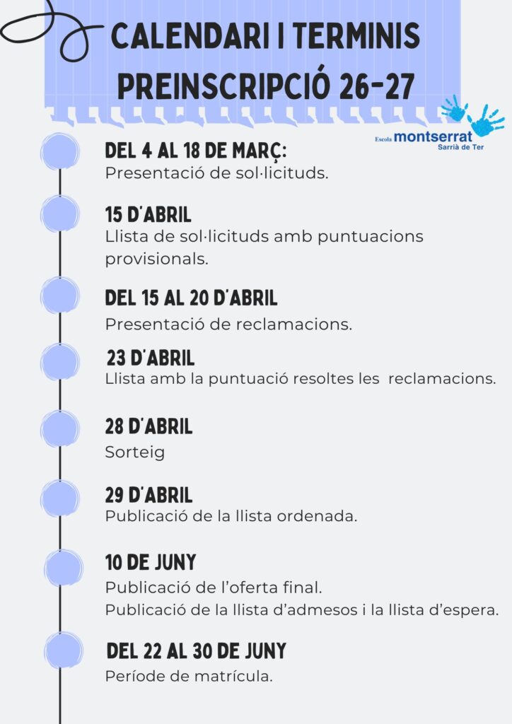 Benvolgudes famílies, aquí us deixem el calendari i els terminis pel que fa a la preinscripció pel curs 2026-2027.