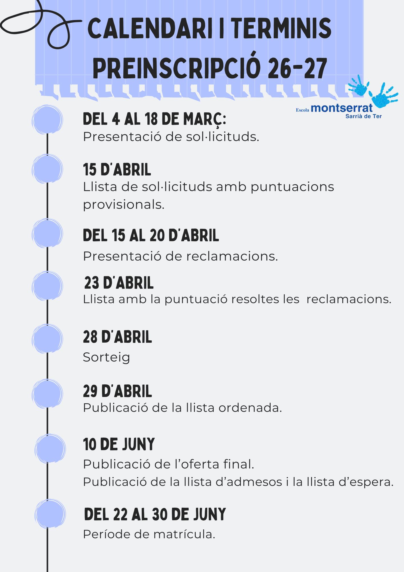 Calendari i Preinscripció pel curs 26-27Per admin / 19 de febrer de 2026 / Portada Benvolgudes famílies, aquí us deixem el calendari i els terminis pel que fa a la preinscripció pel curs 2026-2027.
