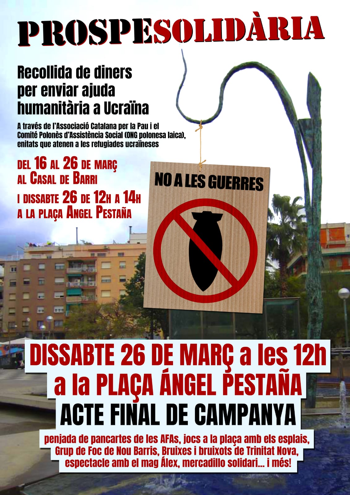 Del 16 al 26 de març podreu fer les vostres aportacions voluntàries al Casal de Barri de Prosperitat. Tots els diners es destinaran a l’Associació Catalana per la Pau i al Comitè Polonès d’Assistència Social (ONG polonesa laica), entitats que atenen a les persones refugiades ucraïneses.