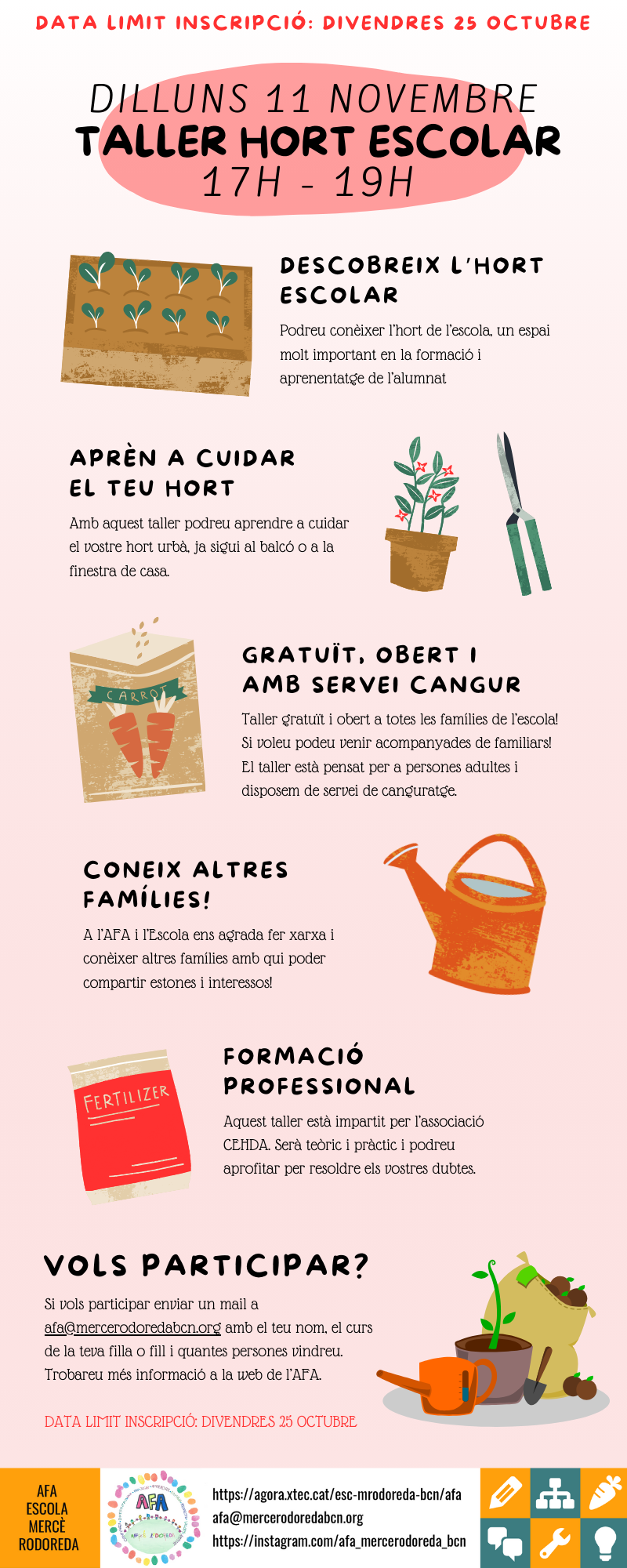 🥕 Per assistir només us heu d’apuntar enviant un mail a afa@mercerodoredabcn.org indicant el vostre nom, el curs de la vostra filla o fill i quantes persones assistireu. Data limit d’inscripció: divendres 25 d’octubre!