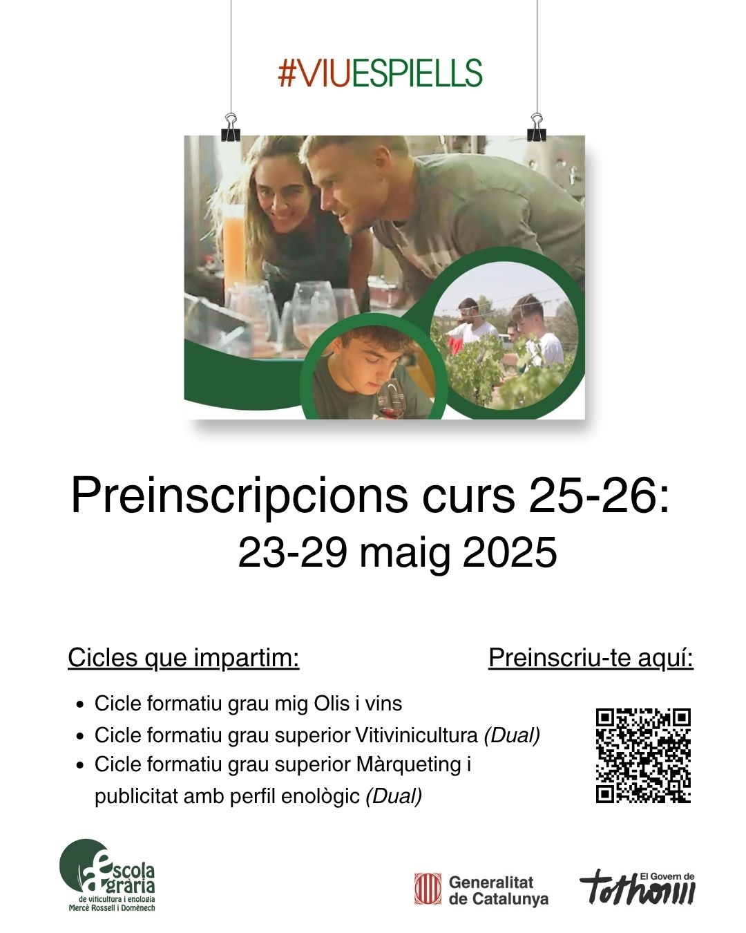 Sant Sadurní d’Anoia, maig de 2025 – L’Escola Agrària de Viticultura i Enologia Mercè Rossell i Domènech (Escola d’Espiells), centre de referència en formació vitivinícola a Catalunya, anuncia l’obertura del període de preinscripció per als seus cicles formatius del curs 2025-2026.